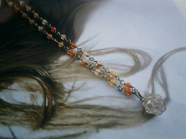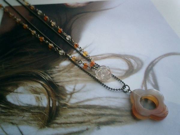 秋の美術館・・シリーズです♪ロマンチックなカーネリアンのネックレス2点セットです♪小粒の丸玉やフラワーリングや薔薇のカーネリアンが大人のロマンチックしています♪長い方のネックレスは華奢なボールチェーンに28ミリ位のカーネリアンのフラワーリングを合わせました♪長さは65センチ+アジャスター15センチで最長80センチ位です♪4ミリの丸玉のカーネリアンは14ミリの薔薇のカーネリアンを合わせて可憐な表情です♪長さは全長65センチ位で調節自由です♪それぞれ単品やブレスレットも出品しています♪♪シンプルで長く着けていただけるデザインを考えて作りました♪ハンドメイドをご理解頂いてノークレーム、ノーリターンでお願いします