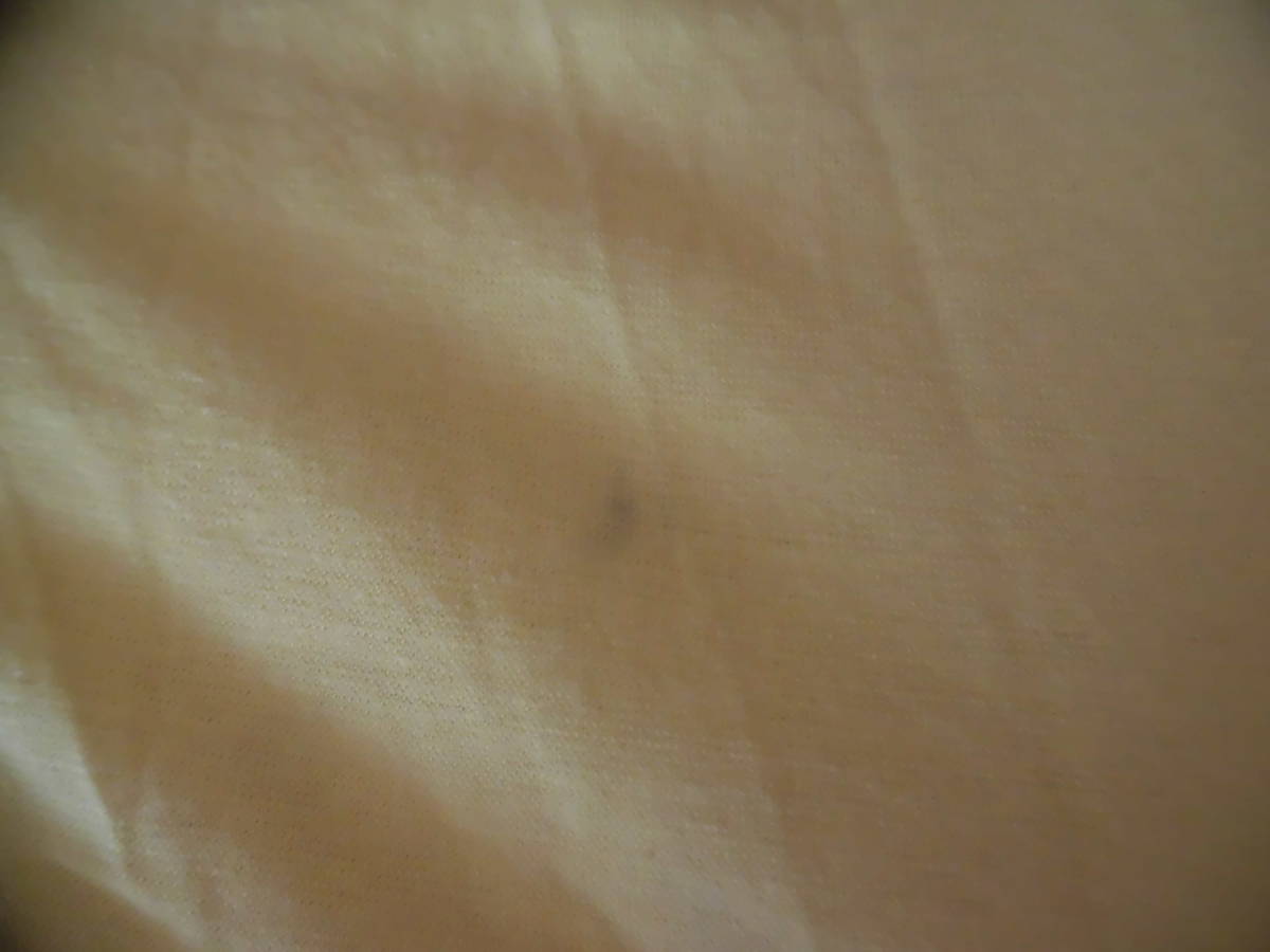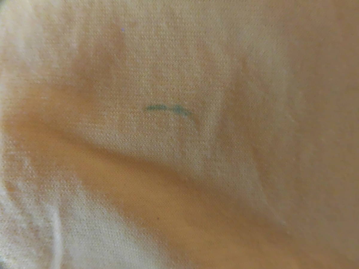 背中に青の線のペン跡、おなかに薄いしみがあります