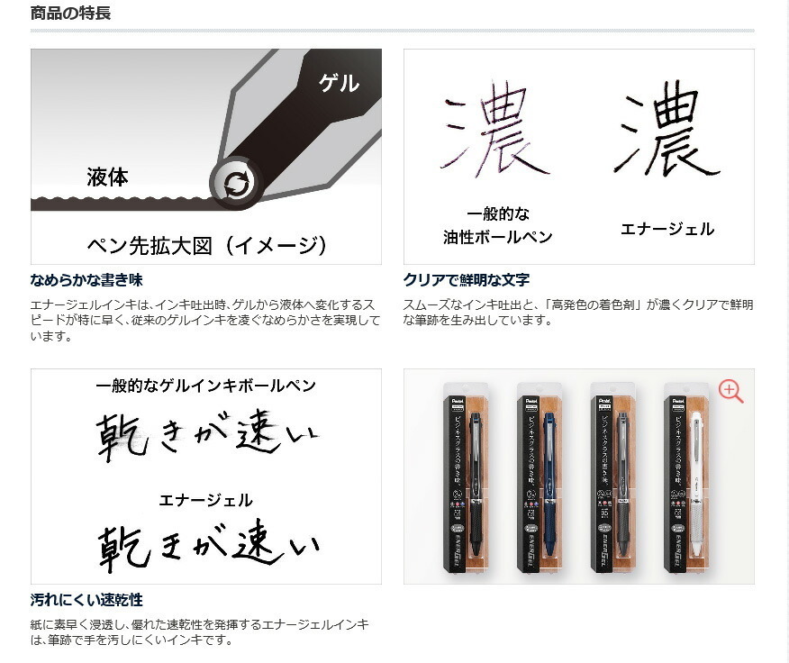 紙に素早く浸透し、優れた速乾性を発揮するエナージェルインキは、筆跡で手を汚しにくいインキです。