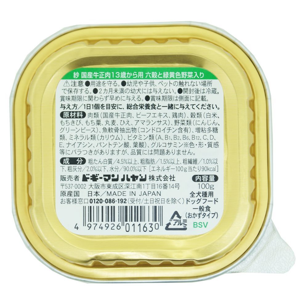 ・国産牛正肉を使用。 ・シニア犬の食べやすさ、満足感のためのあらつぶしペースト。牛肉本来の濃厚な旨味と香りが自慢です。 ・国産米とビタミン、ミネラル、食物繊維が豊富な5種類の雑穀入り(もちきび、もち粟、丸麦、ひえ、アマランサス)。雑穀特有の香ばしい香りや甘みも魅力です。 ・国産牛肉のおいしさを、より引き立てる牛だしベースの「こく旨仕立て」。ビタミンを含む緑黄色野菜(にんじん、グリーンピース)入り。 ・発色剤、着色料、酸化防止剤、不使用。