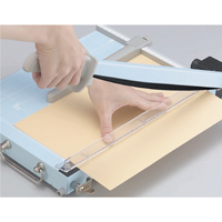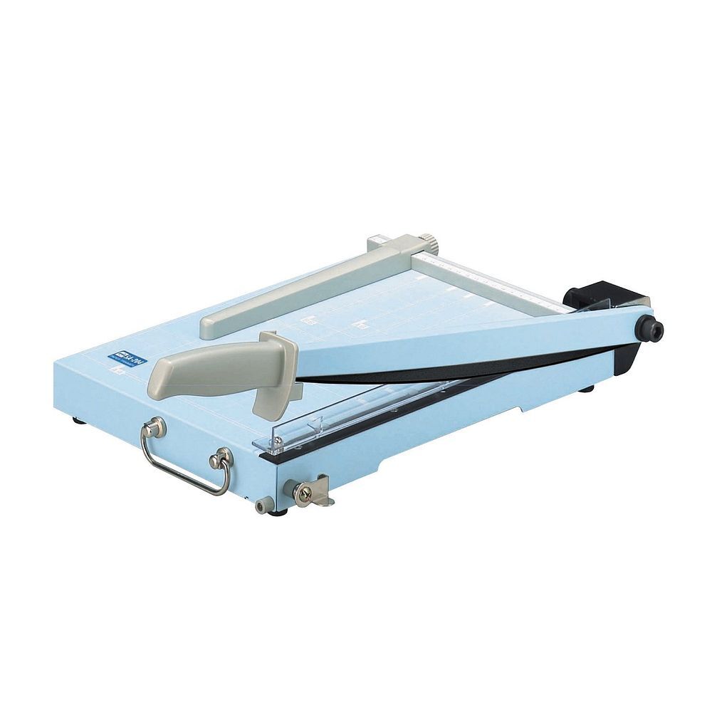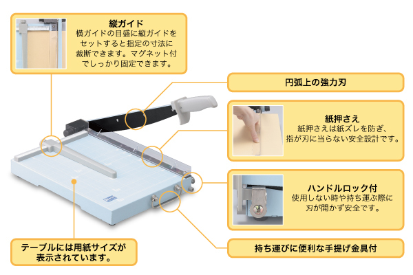 「円弧状の強力刃でラクラク裁断」「持ち運びに便利な手提げ金具付き」「透明紙押えで裁断位置が確認出来ます」「ハンドルストッパー付」「テーブルには用紙サイズが表示されています」