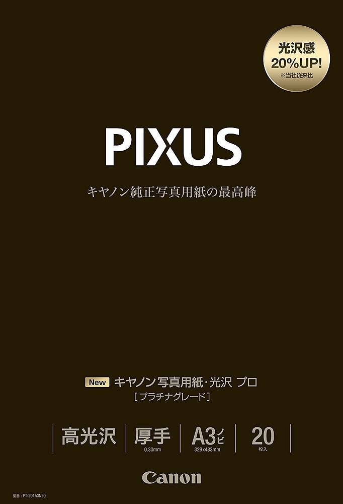 PIXUSインクジェットプリンター写真用紙(光沢紙)のフラッグシップモデル。従来製品(PT-101)と比べ、光沢度20%UP、耐傷性50%UPと商品力が大きく向上