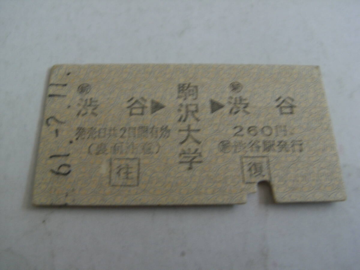 東京急行電鉄 往復乗車券 渋谷→駒沢大学→渋谷 昭和61年2月11日 新 渋谷駅発行 東急