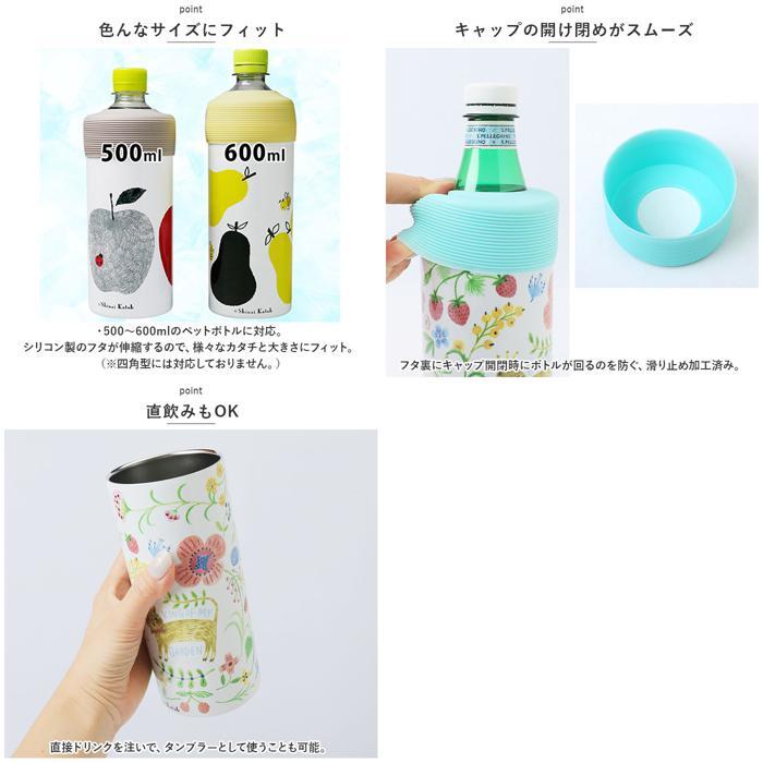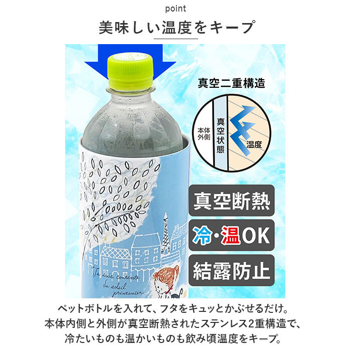 | 商品説明 | ・・冷えたペットボトルをそのままIN☆「真空保冷ペットボトルホルダー」が登場。 ・【美味しい温度をキープ】 ・ペットボトルを入れて、フタをキュッとかぶせるだけ。本体内側と外側が真空断熱されたステンレス2重構造で、冷たいものも温かいものも飲み頃温度をキープ。 ・【結露を防いで快適】 ・結露で周りを濡らすことなく、デスクの上や車内のカップホルダーに置いても安心。 ・【色んなサイズにフィット】 ・・500~600mlのペットボトルに対応。シリコン製のフタが伸縮するので、様々なカタチと大きさにフィット。(※四角型には対応しておりません。) ・【キャップの開け閉めがスムーズ】 ・フタ裏にキャップ開閉時にボトルが回るのを防ぐ、滑り止め加工済み。 ・【直飲みもOK】 ・直接ドリンクを注いで、タンブラーとして使うことも可能。 ・【様々なシーンで】 ・傷つきにくく耐久性のある素材。持ち運びしやすく、アウトドアやスポーツシーンなどにもぴったり。 ・【お気に入りが見つかるキュートなデザイン】 ・個性が光るアニマルデザインなどをラインナップ!お好みで選んで、毎日のお出かけの相棒に♪ |