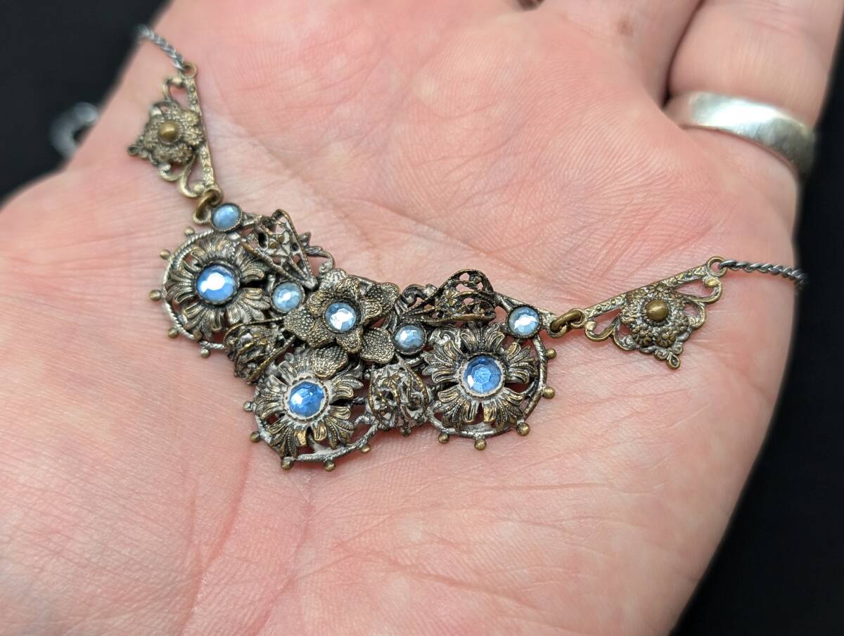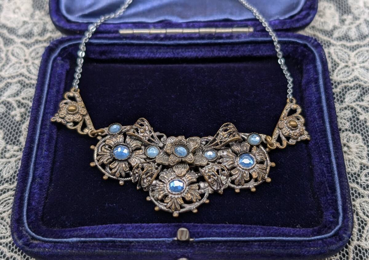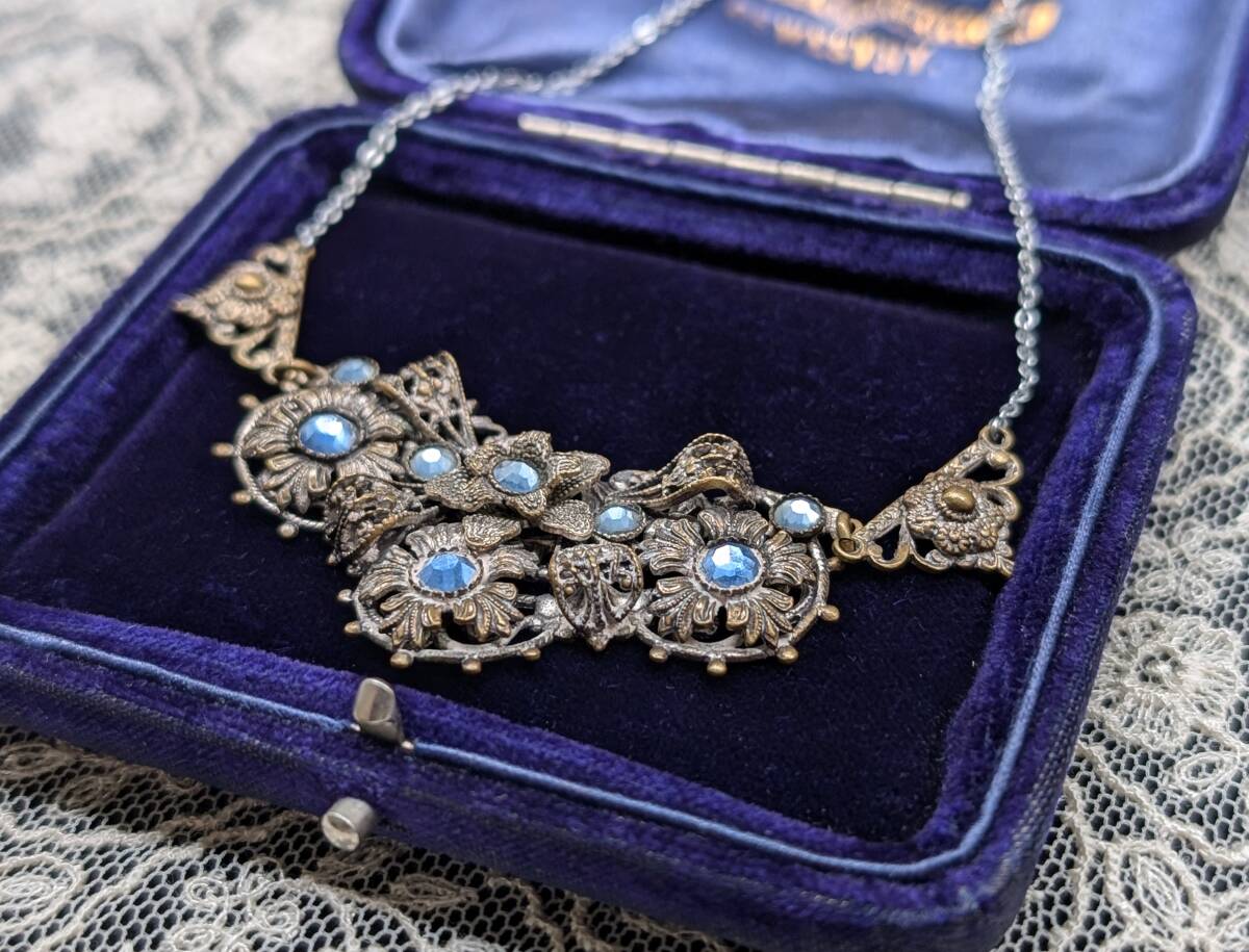 イギリスヴィンテージ 30’sチェコガラスネックレス /ネイガー風/花フラワー英国ヴィンテージアールデコ20’sブライダルΓOT