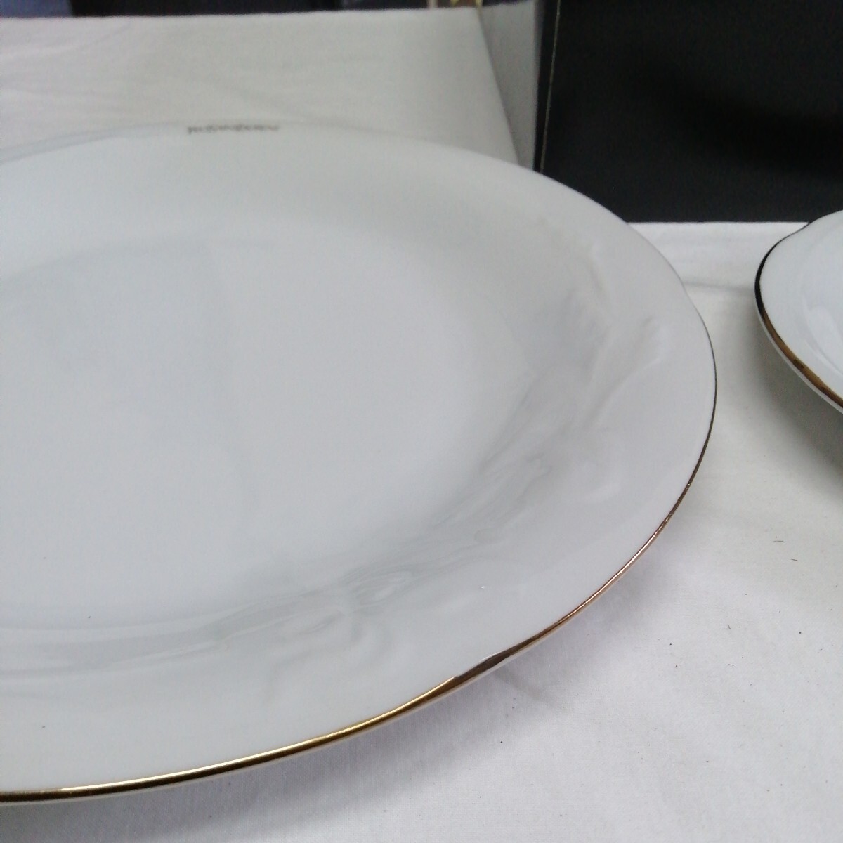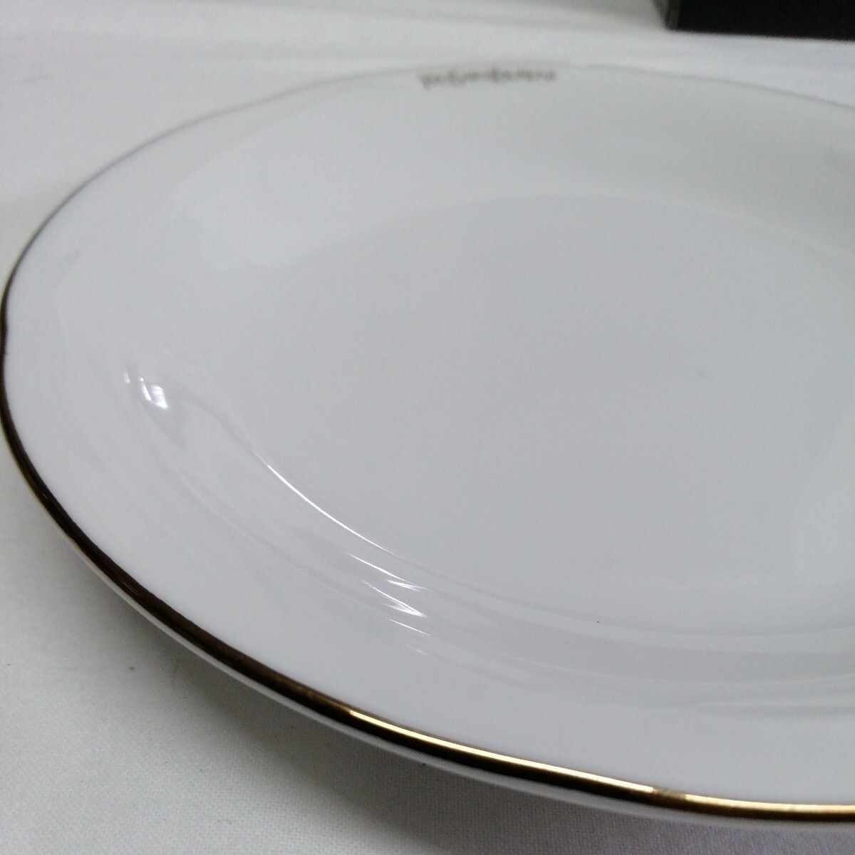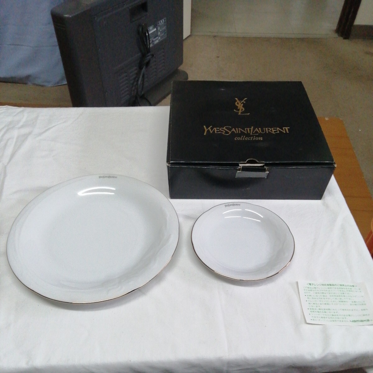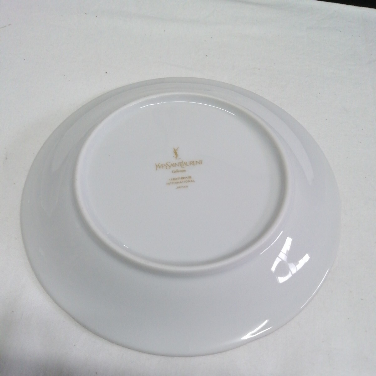 箱入未使用品 イヴサンローラン パーティセット 大皿1 小皿5 ホワイト 浮き彫り 金縁 金製品 JAPAN 洋食器 陶磁器 ケーキ皿