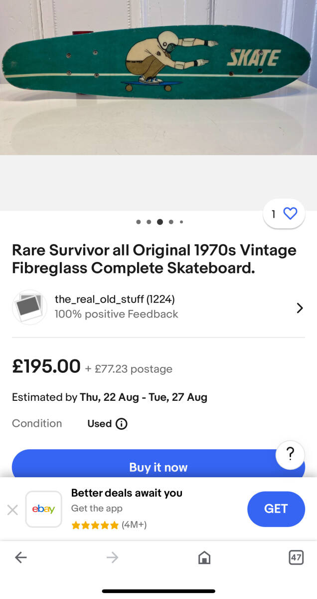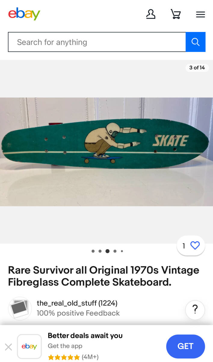 1970年代のファイバーグラススケートボードです!男心くすぐる絵柄が描かれています!4枚目5枚目の写真はebayで出品されている参考価格です!もう1点出てますが4万円オーバーです!