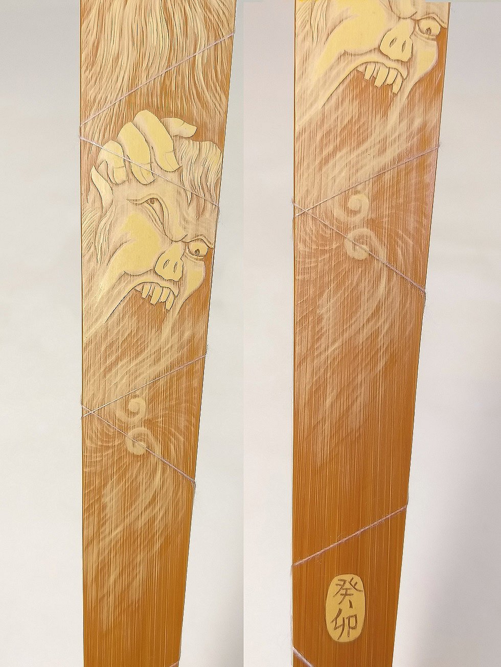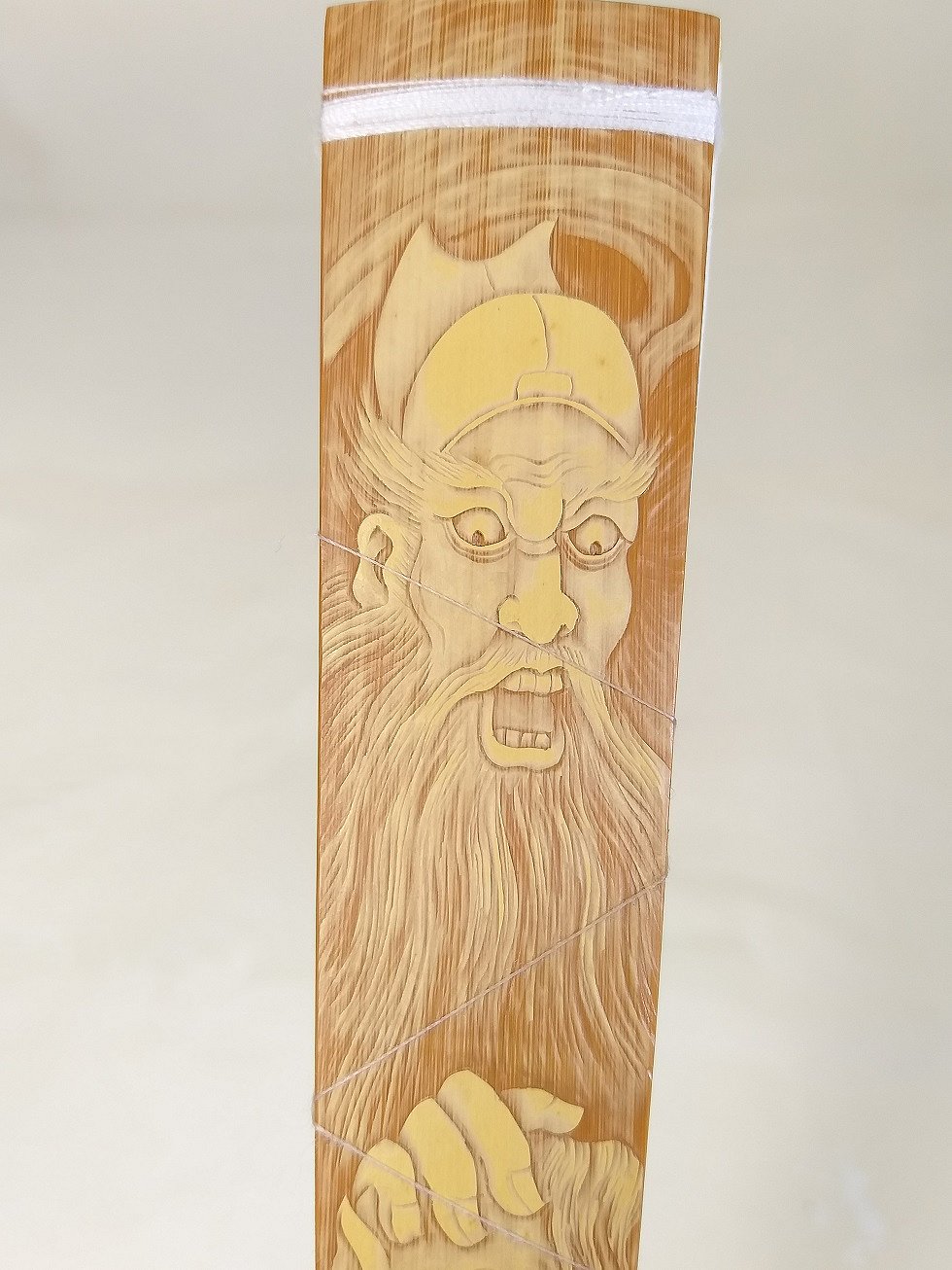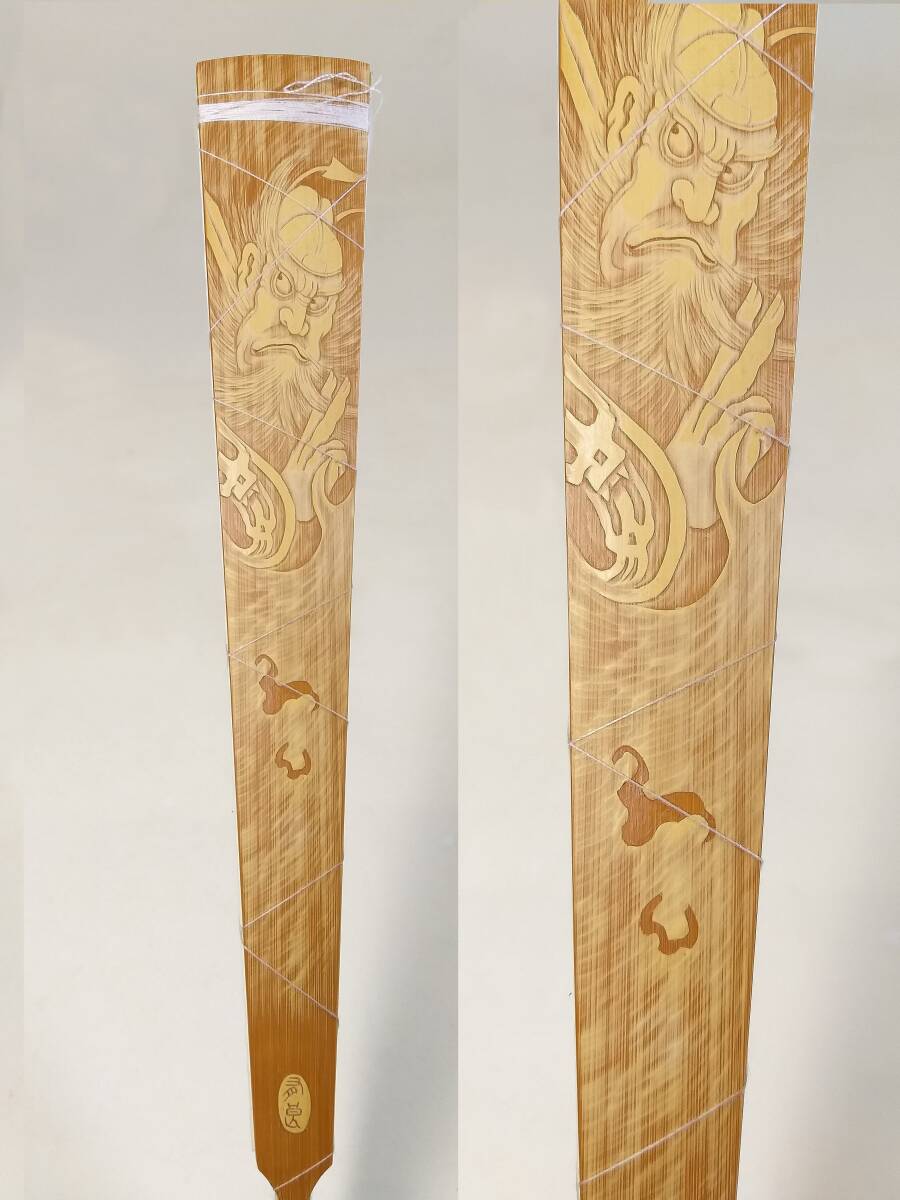 現在出品に使用の天然世界最高級特大珍稀野生銘竹金絲玉竹の特徴は:①油性が、非常に良質で、②密度が最も高く、③色合いが、最極上の棕紅色です。④重厚感が充分あります。⑤木紋紋理は、非常に綺麗です。⑥留青層の厚さは、たいへん濃厚です。竹材は最高の熟成状態です。⑦最高の彫刻品質です。