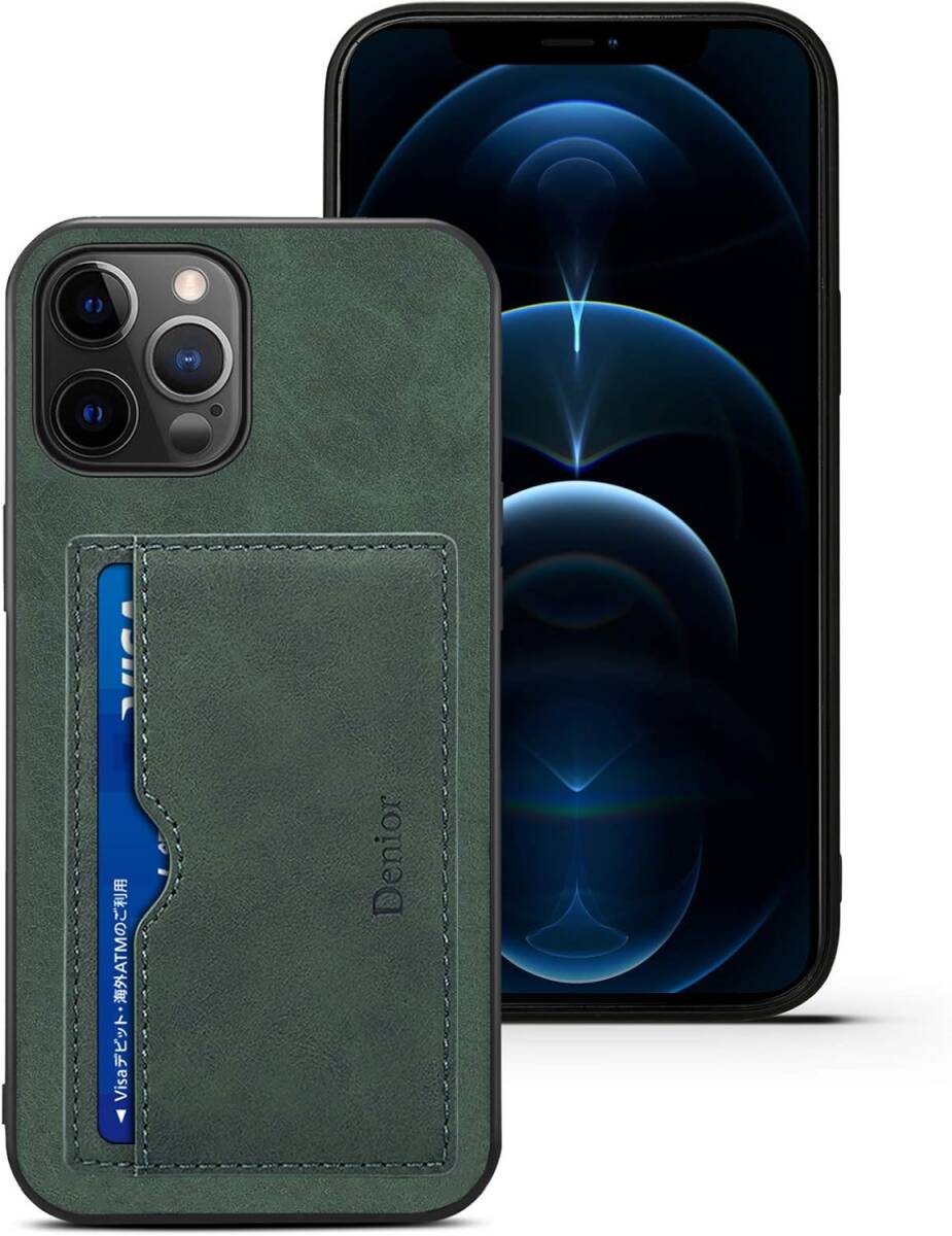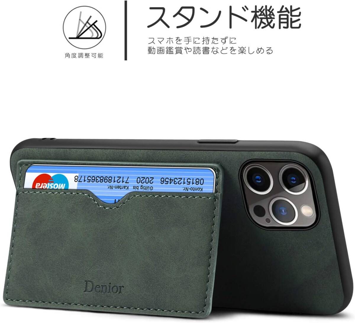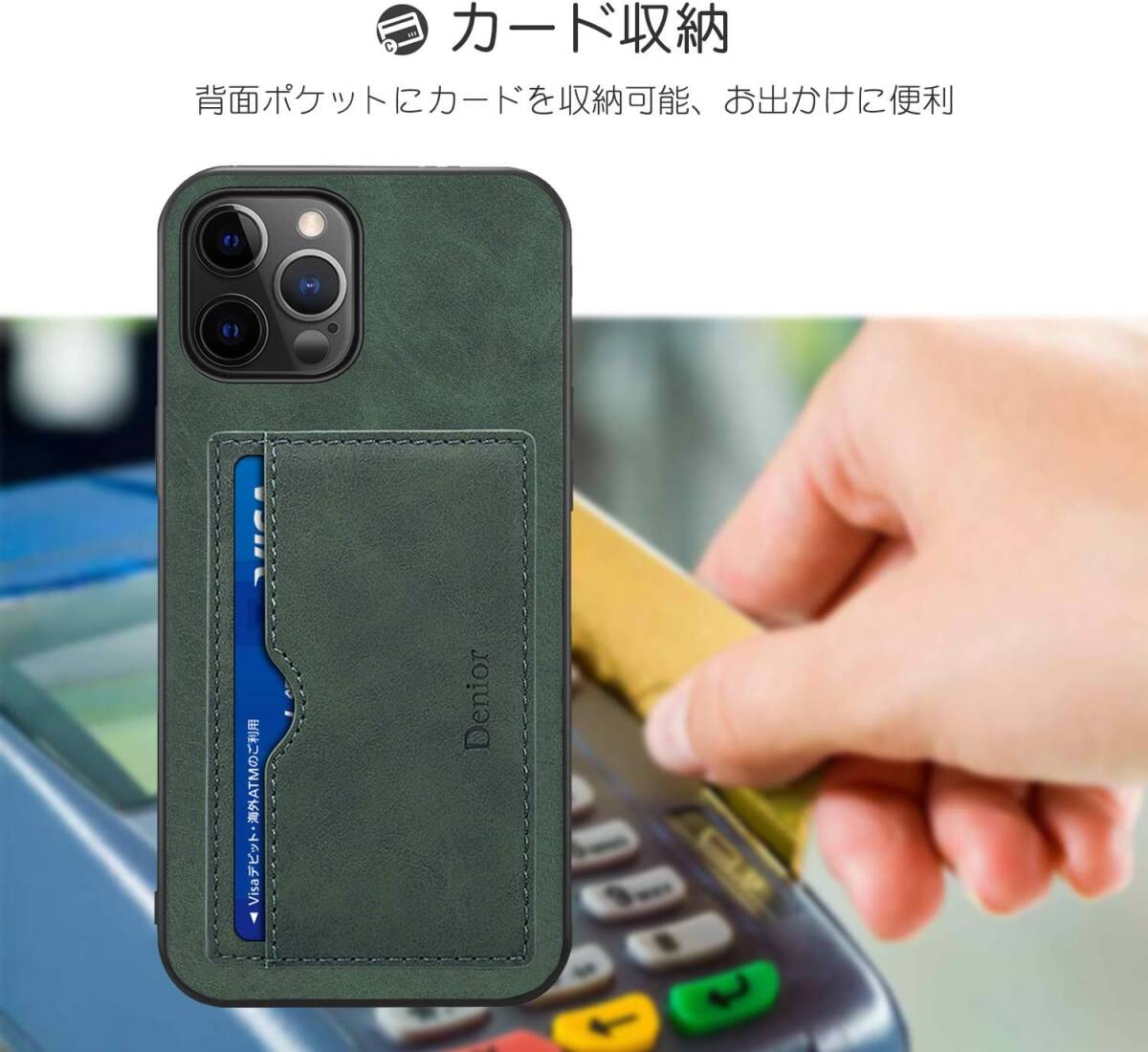 iPhone12 ケース/iPhone12Pro ケース 6.1インチ用 薄型 背面ポケット付き PU+TPU素材 スマホカバー(グリーン)/S253