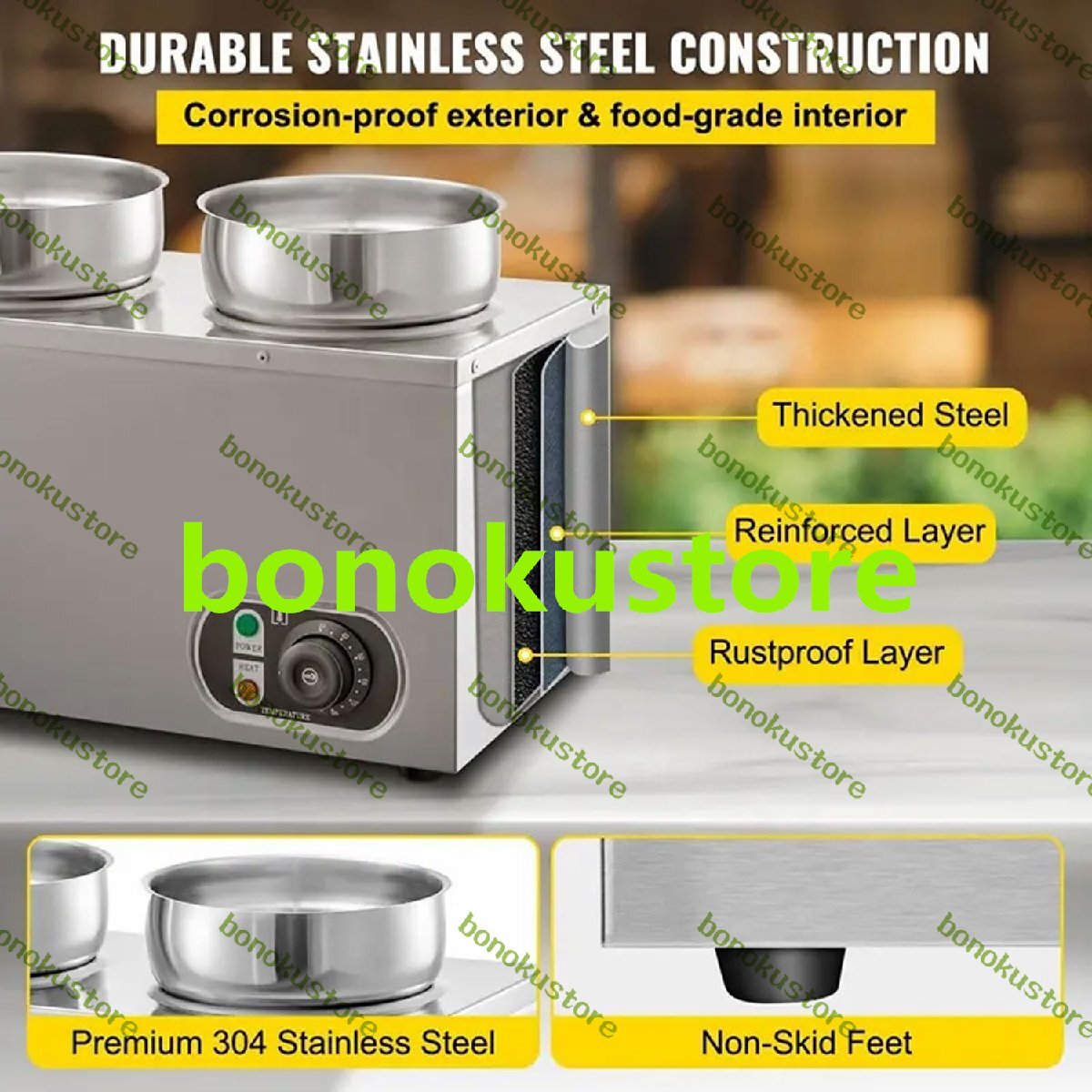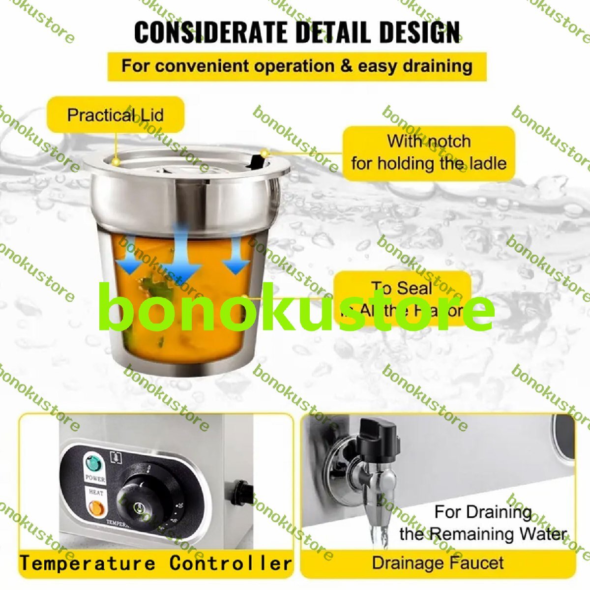 容量: このステンレス鋼のベインマリーには大容量の鍋が付属しており、コンパートメントと蓋付きの6.2QT丸型鍋が4つ付属しているため、スープから好きなだけ料理にメニューを変更できます。