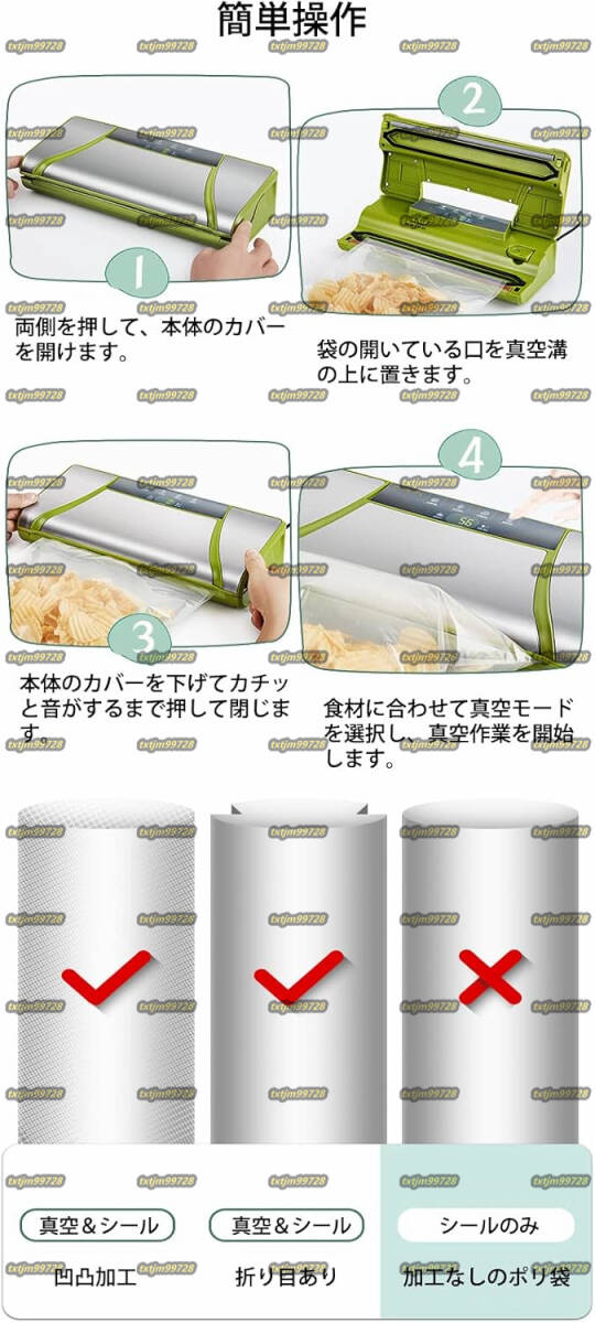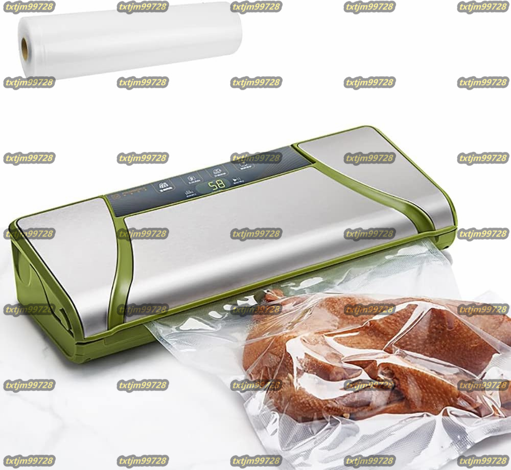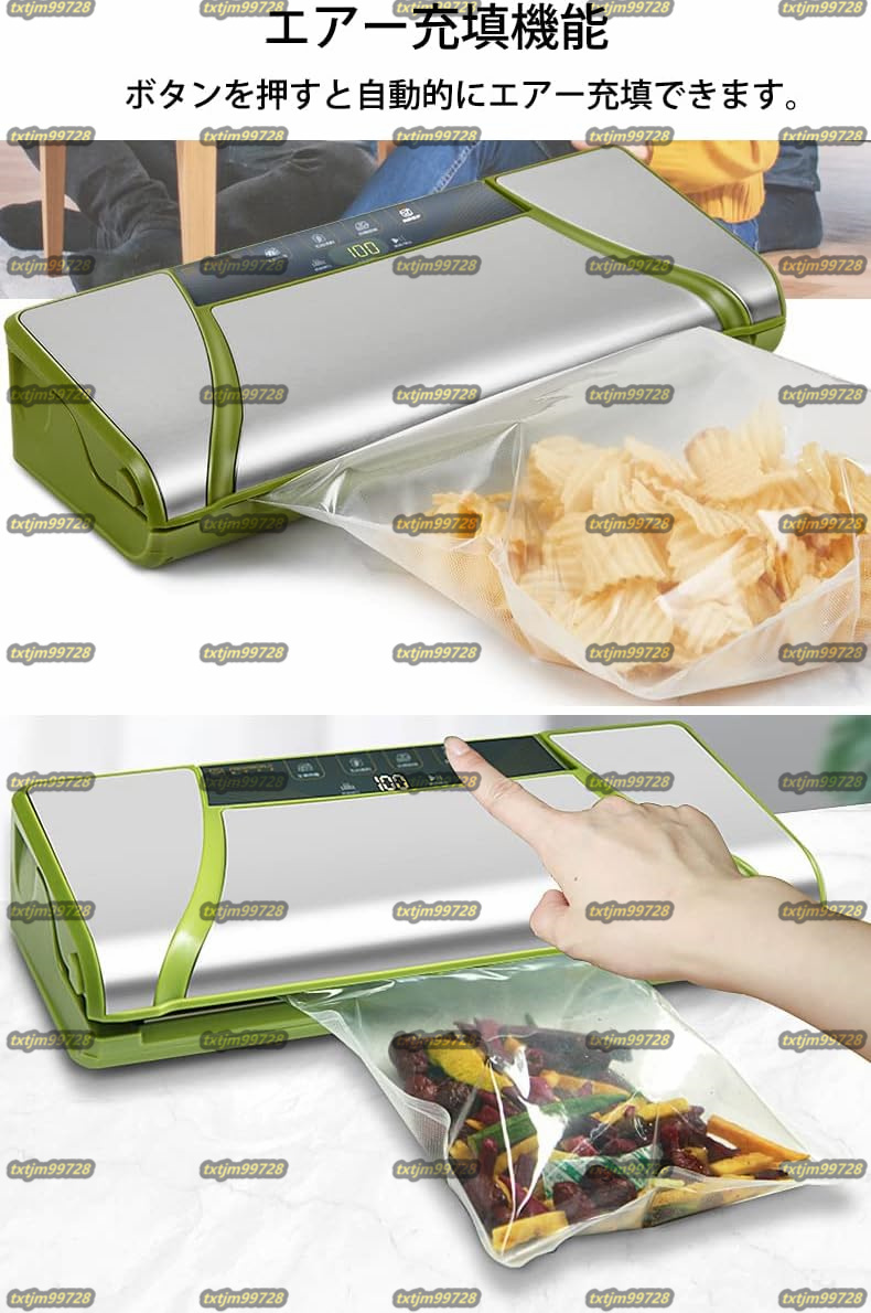 【商品スペック・仕様】: 製品名:バキュームシーラー 用途:食材の鮮度維持、ペットフードの小分け保存、衣類のコンパクト収納、匂い移し防止などに 電圧:AC100-220V 50/60Hz 出力:15W(真空する時)、110W(シールする時)本体材質:ABS+ステンレス鋼 吸気性能:-60~-75Kpa 真空速度:15L/Min 寸法:37cm*16cm*16cm 製品重量:約1.9kg 最大シール長さ:32cm シール幅:3mm 付属品:真空袋ロール*1本(25*500cm)