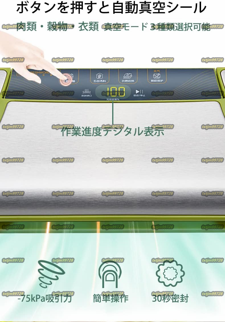 【真空度調節可能】肉類・穀物・衣類の真空密封モード選択できます。脱気ボタンを押すと手動で真空度をコントロールできます。材料の種類に合わせて細かく真空度を調節できます。