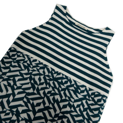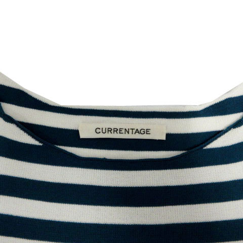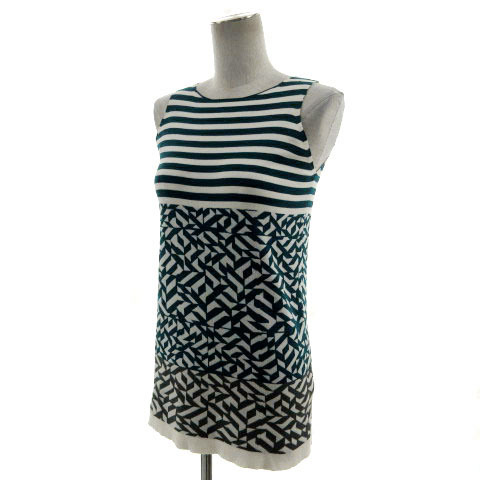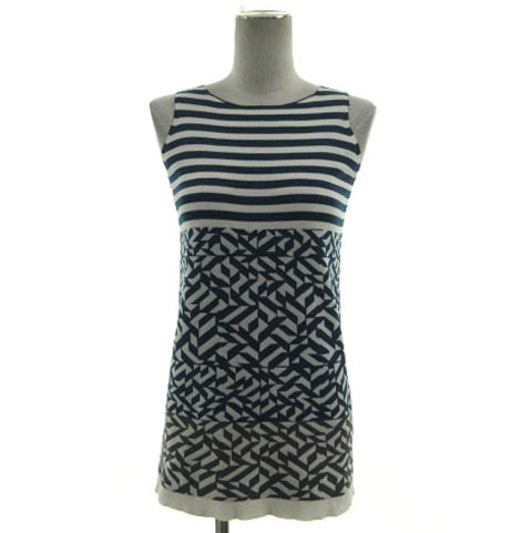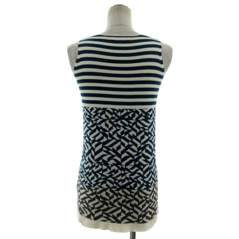 カレンテージ CURRENTAGE ニット ノースリーブ コットン混 ボーダー 幾何学柄 ホワイト 白 ブルー系 青系 グレー レディース
