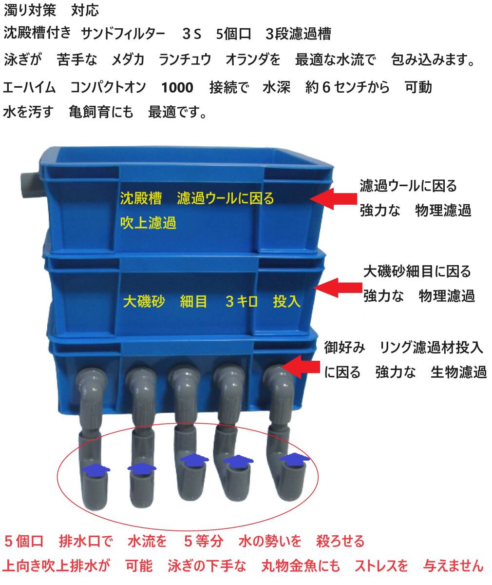 沈殿槽BOX 搭載 排水口 5個口 魚に優しい サンドフィルター 3S 3段タイプ  濾過砂 ホース付き ポンプ無し 11