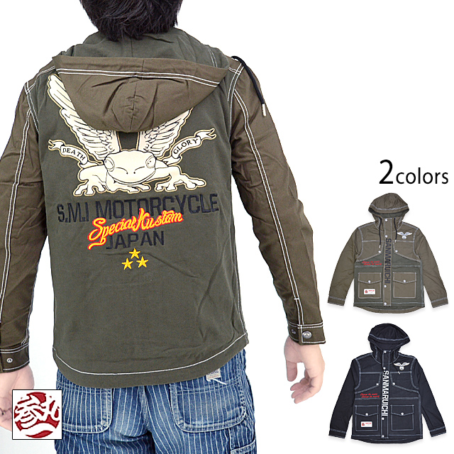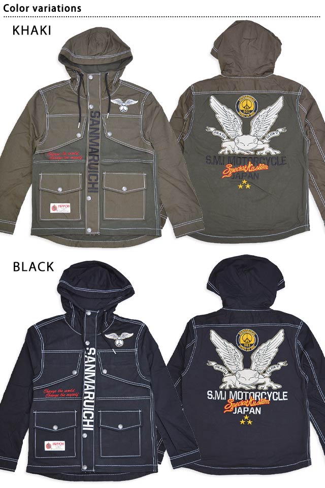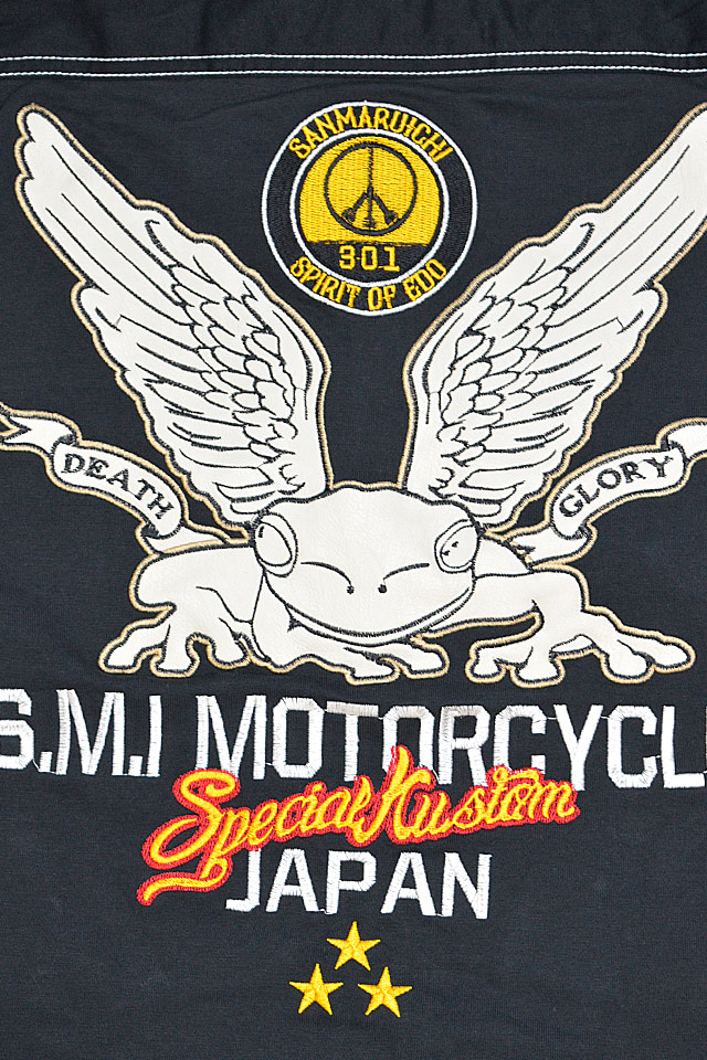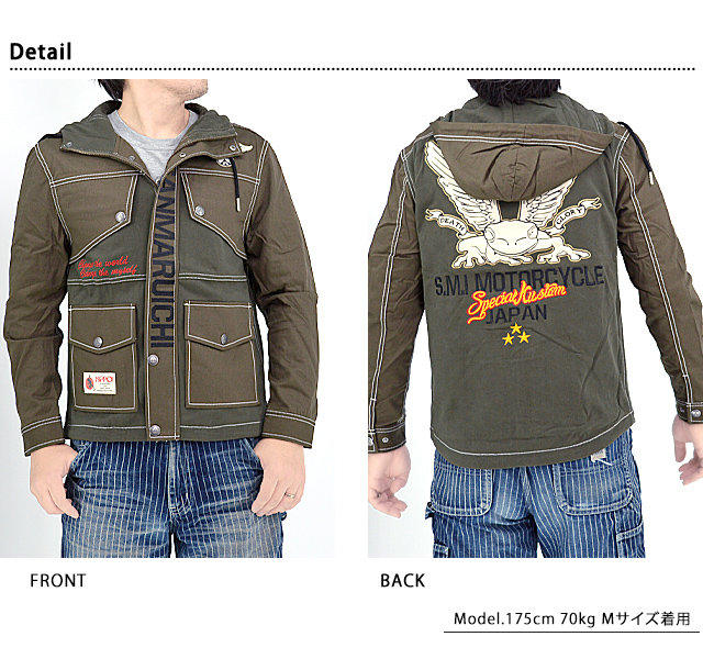 「参丸一」さんから「マウンテンパーカー(SOP-11066)」のご紹介です。 翼を携えた蛙がインパクト抜群! 和とバイカーテイストを組み合わせた和洋折衷のマウンテンパーカーです。 背中には合皮と刺繍で表現されたちょっとやんちゃな蛙の姿が。 フロントの合わせ部分にはブランドロゴを刺繍しました。 身頃にはレタードをデザインし、ポケットにはブランドオリジナルの布タグが縫い付けられています。 フロントはハイジップとボタンの二重構造。 胸元のボタンを外すと、内側からポケットが顔を覗かせます。 ボタンやオリジナルの布タグなど、細かいところにまで拘り、作りこまれた逸品です。 | |||||||||||||||||||||||||