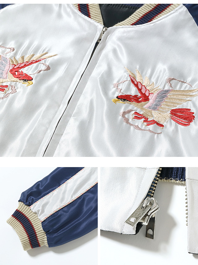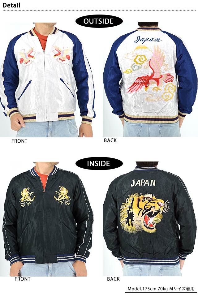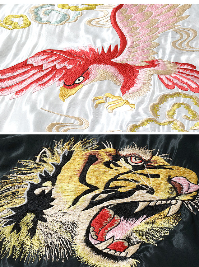 探求心と情熱を持って、上質なアイテムを製作し続けている「テーラー東洋」から、Early 1950s Style アセテートリバーシブルスカジャン「RED EAGLE × TIGER HEAD」(TT15542-190)のご紹介です。 表面はヴィンテージでも珍しい赤鷲の絵柄。 1950年代前期の作品をもとにしており、シルバーのボディに鮮やかなレッドイーグルが映えています。 通常、スカジャンのボディは濃色の身頃に対して袖に薄い色を組み合わせたものが主流ですが、この作品はボディよりも袖の色が濃い「逆配色」パターン。 さらにリブもオフホワイトに濃色のラインが入った逆配色となっており、淡色を基調とした斬新な仕上がりです。 リバーシブル面は対照的に身頃も袖も黒一色のボディ。 刺繍は迫力ある虎の顔を細部まで緻密に表現した通称「タイガーヘッド」と呼ばれる人気の絵柄で、頬の毛や鬣(たてがみ)は針足を何度も変えながら一本一本繊細に描かれており、優れた職人の手掛けた作品であることがわかります。 リブにはあえて他の配色と無関係のネイビーのリブが使われていますが、これもヴィンテージをもとに再現した仕様です。 スーベニアジャケットのなかで最もスタンダードな両面にアセテート生地を使ったリバーシブルタイプ。 戦後当時のスカジャンには、シルクに似た高級感を持つ物資統制外品目のアセテートが使われていました。 中綿がないため季節を問わず着用でき、独特なドレープ感も魅力といえます。 1枚持っているだけでずっと使えるアイテムです。 | ||||||||||||||||||||