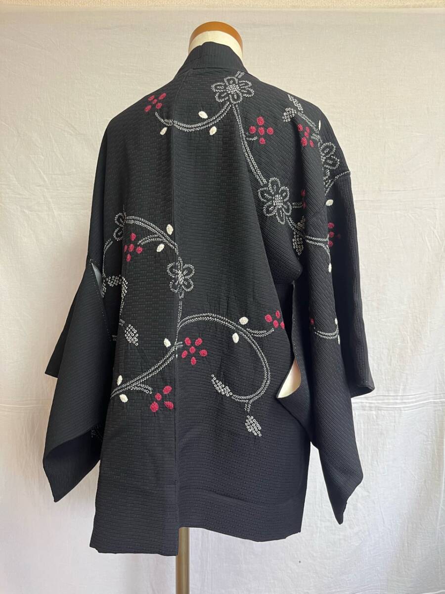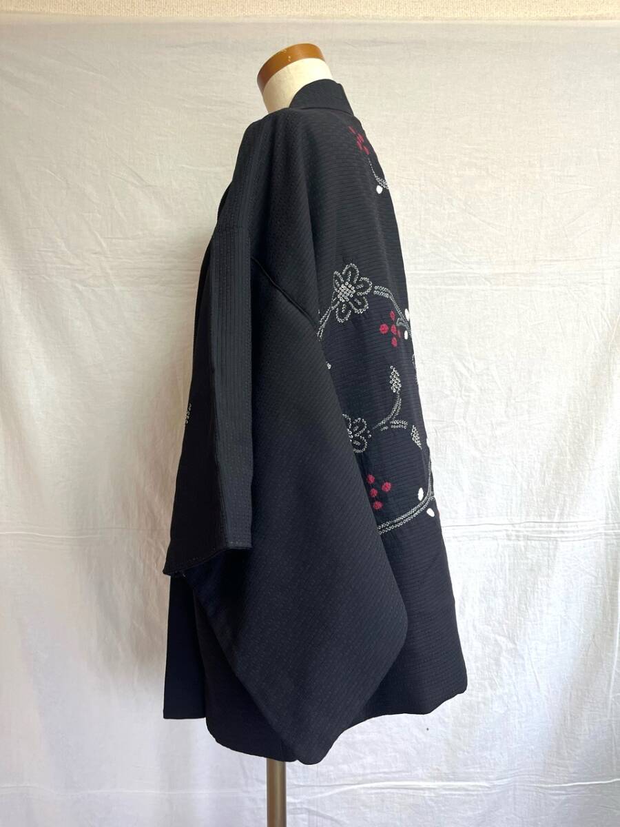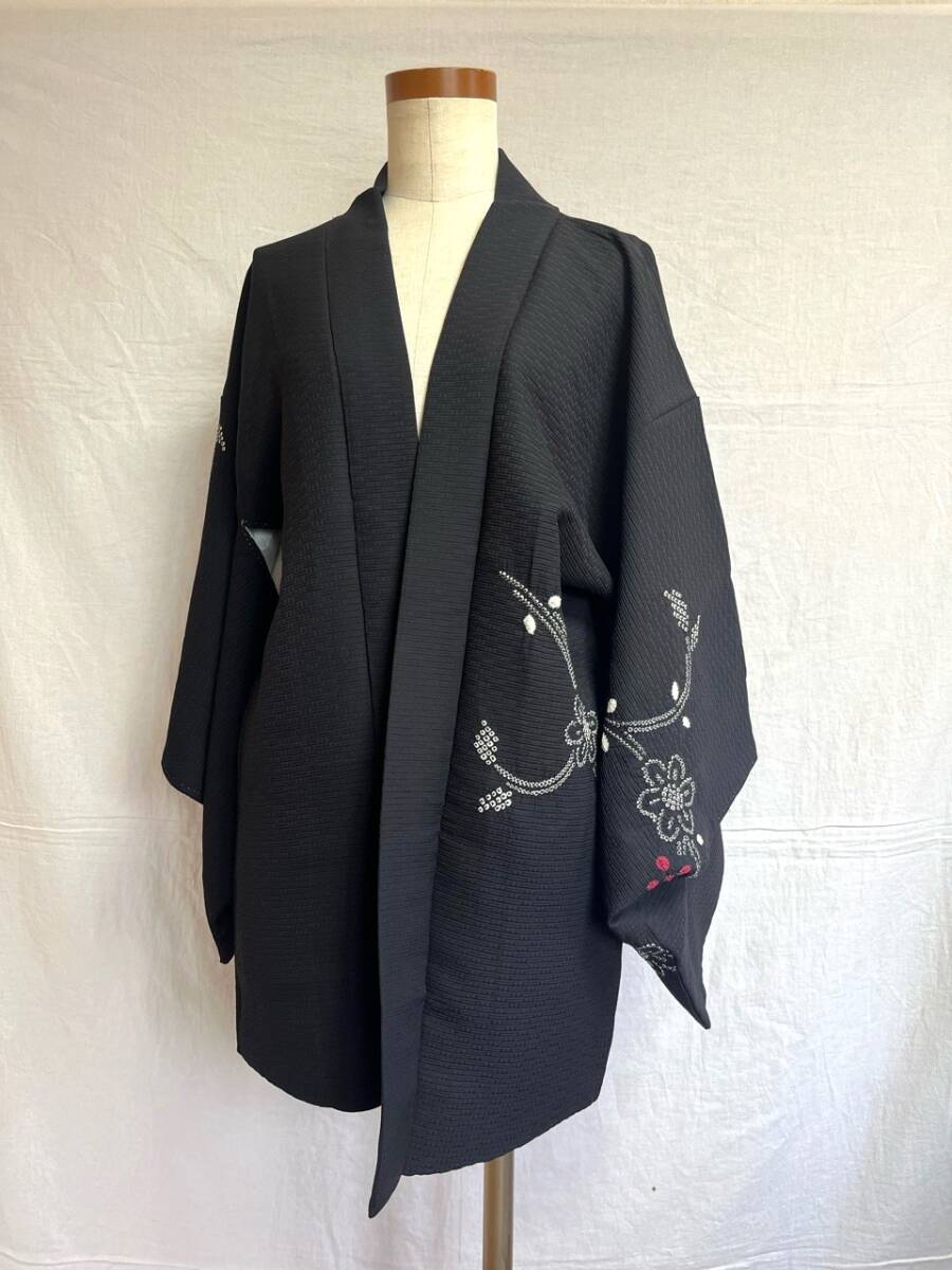 0001★羽織*黒*手縫い*花*柄*模様*道中着*着物*和服*和装*レトロ*アンティーク*お得*レディース★