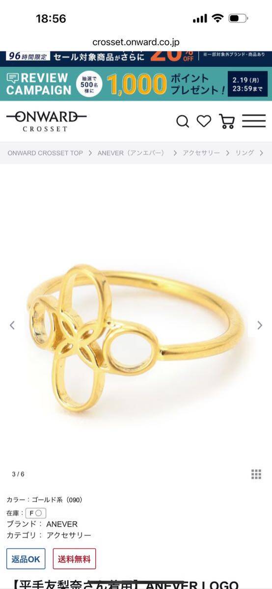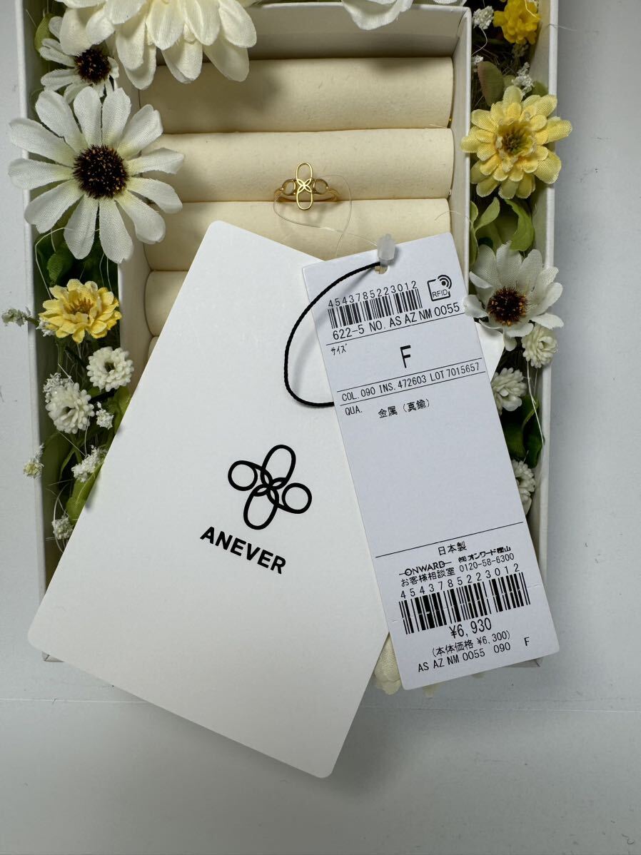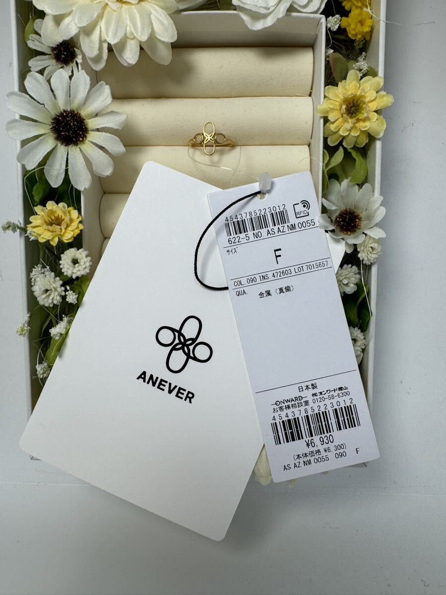 一瞬と永遠を数字に置き換え、0と9の組み合わせでつくられたANEVERのロゴマークのモチーフを指に沿うよう曲面にしたシンプルなデザインの指輪です。サイズは11号設定です。