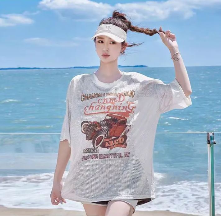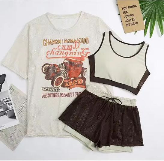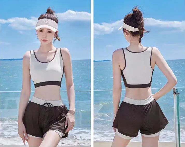 【Mサイズ brown 3点セット】女性用スリーピーススポーツ水着、ルーズカバーアップ、日焼け止め、学生、温泉、学生モデル、スプリット