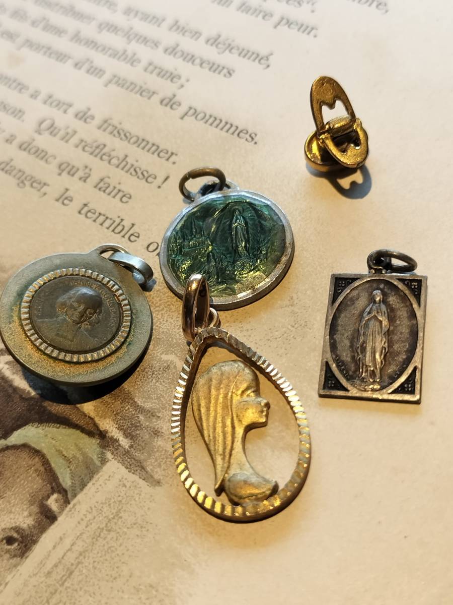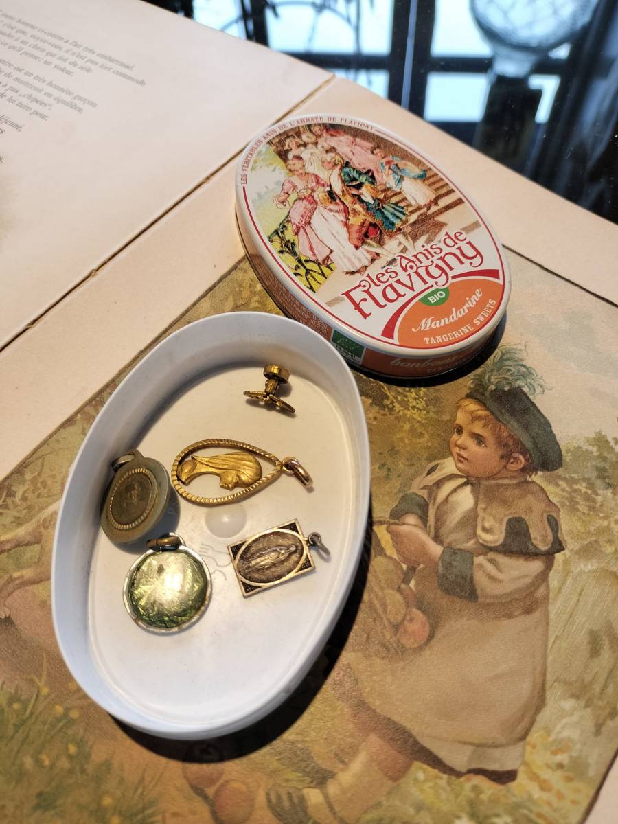フランス アンティーク 可愛いあめ Mandarina Flavigny の中に ルルドの泉 マリア様 メダイ ホーロー 4点セット!