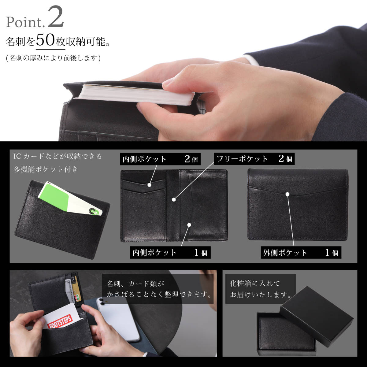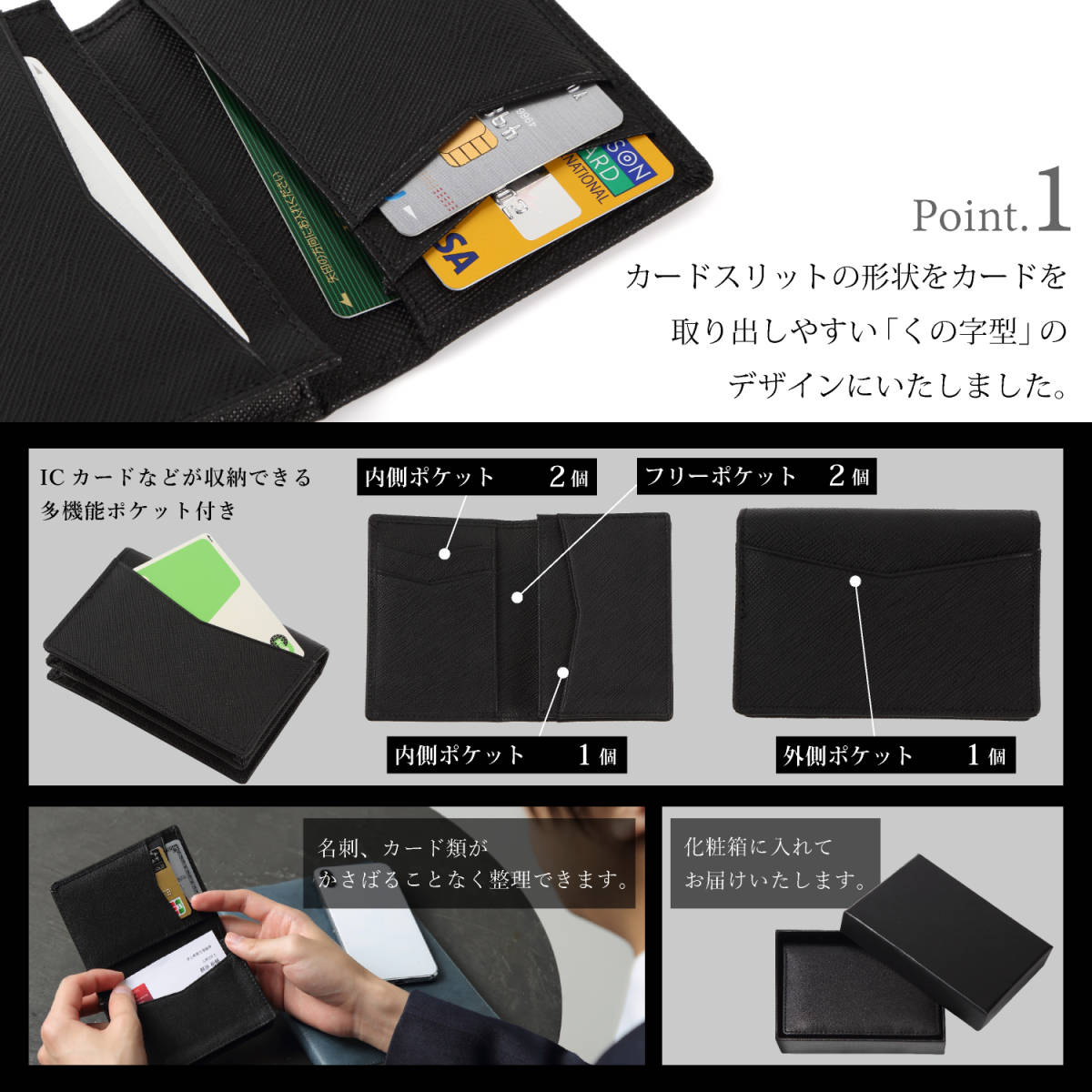 • 【大容量の名刺とカードの収納】名刺50枚程度収納可能です。大容量なので名刺切れのリスクを減らせます。カード入れも5か所ありカードケースとしての機能も充実しています。