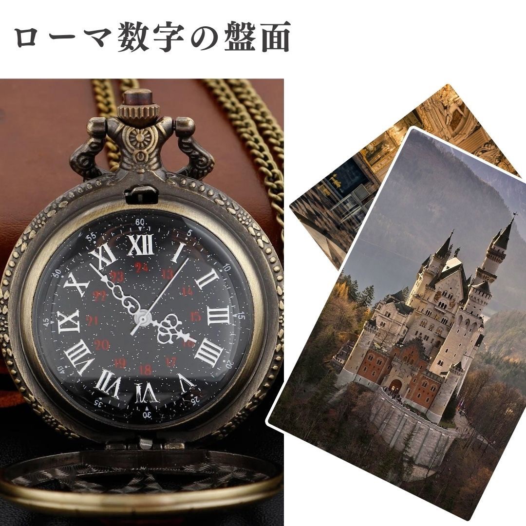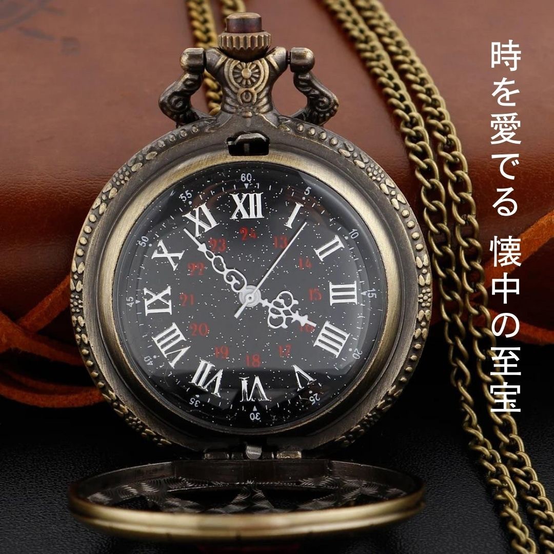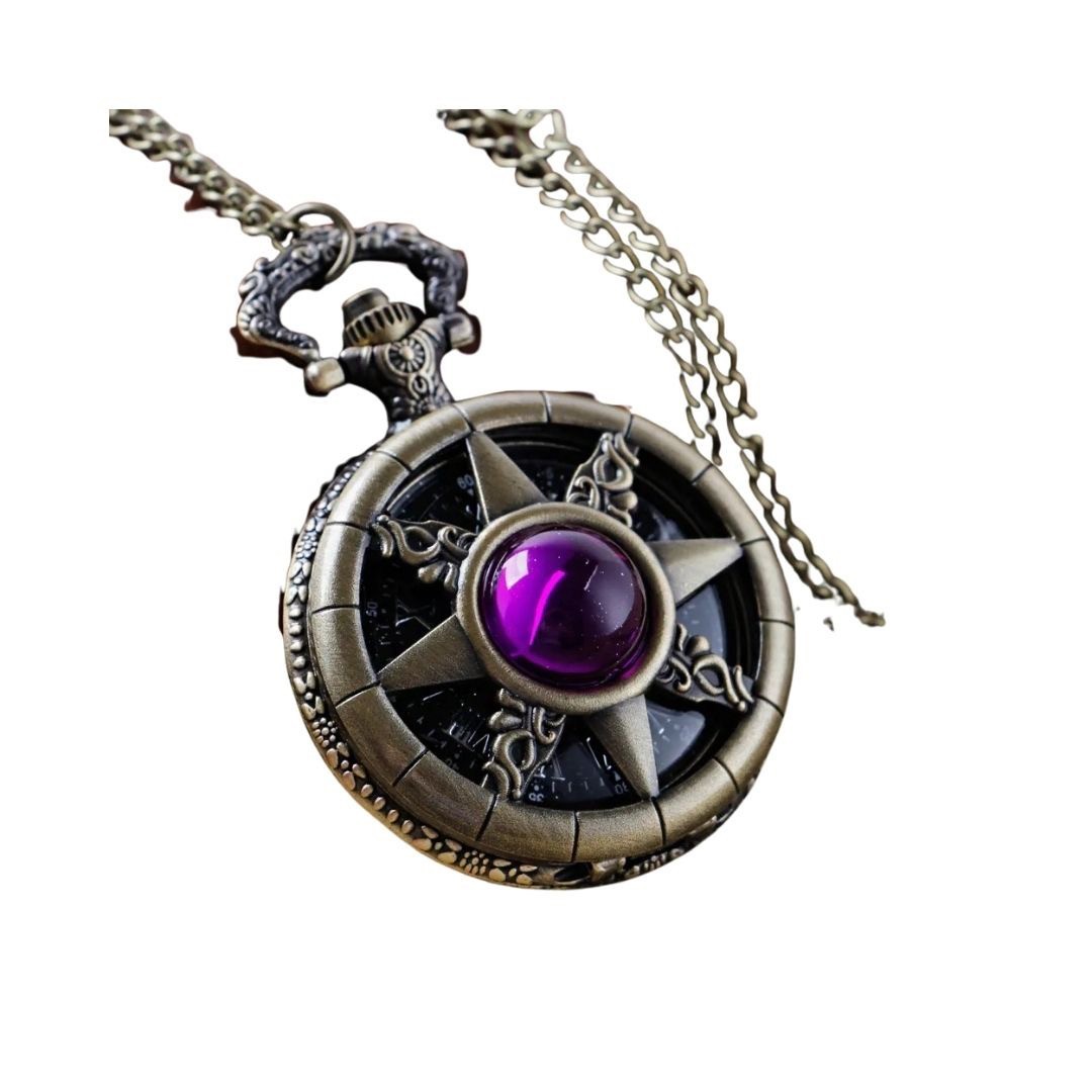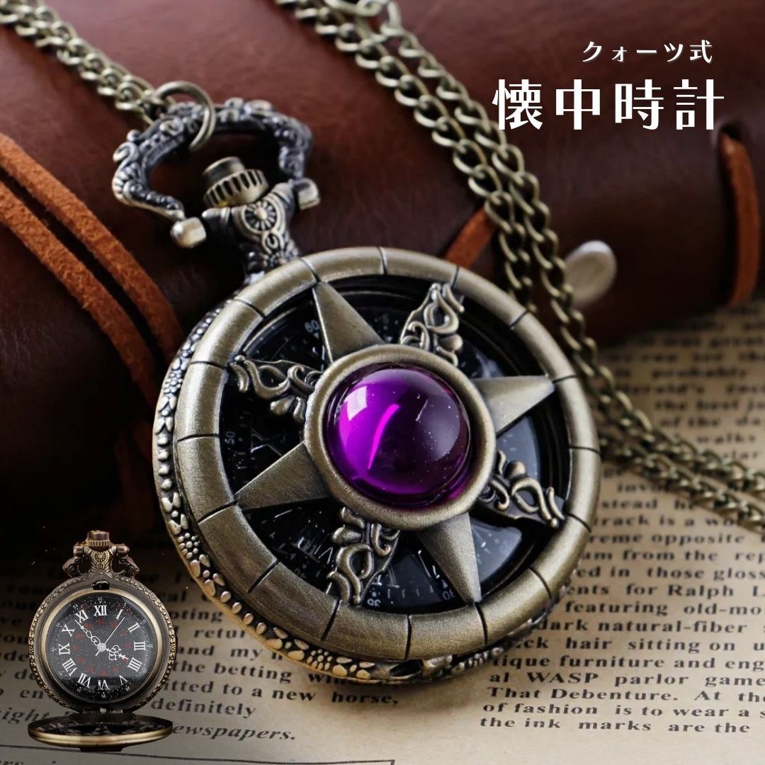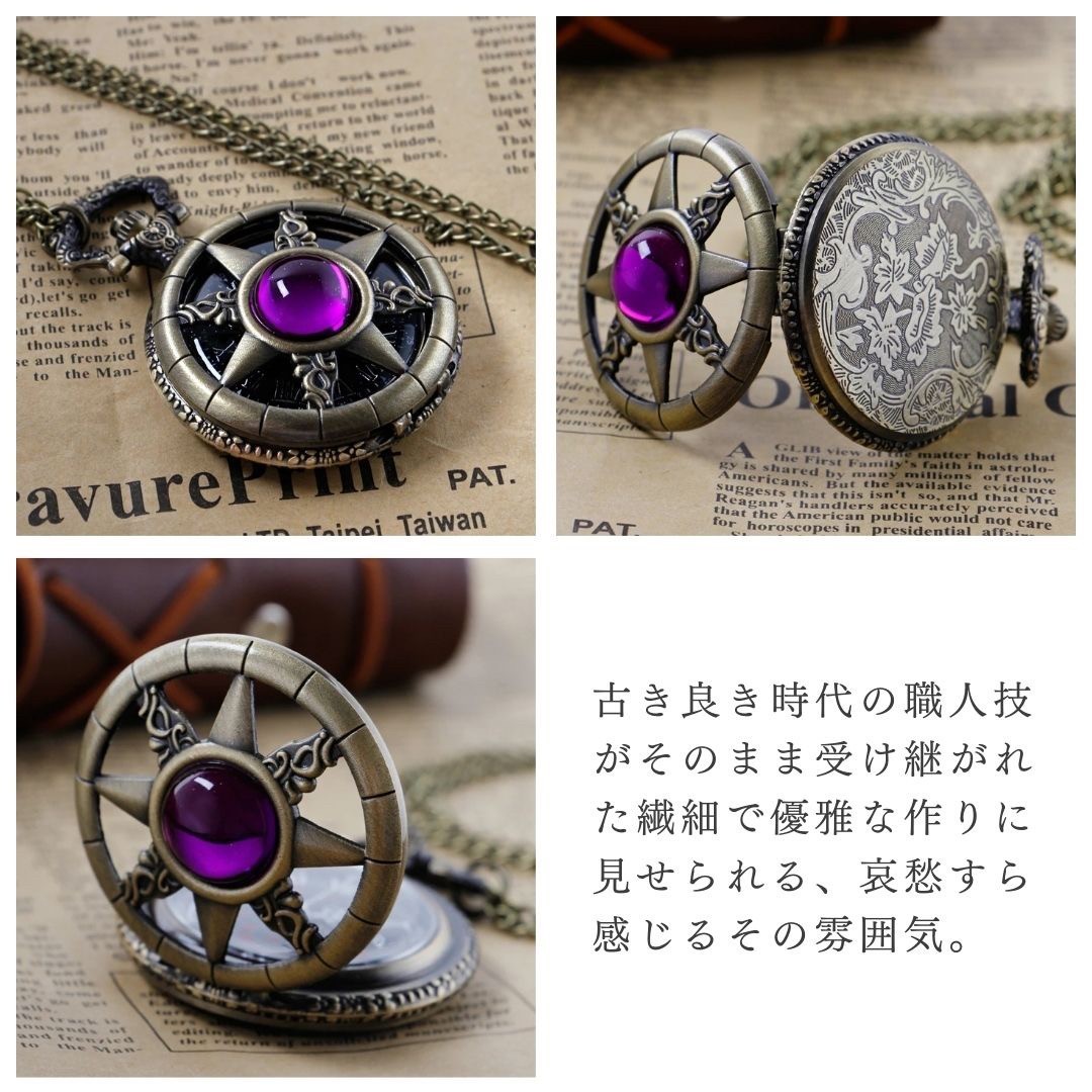 懐中時計 八芒星 パープルジュエリー ブロンズ アンティーク風 チェーン付き 高耐久性 文字盤 メンズ