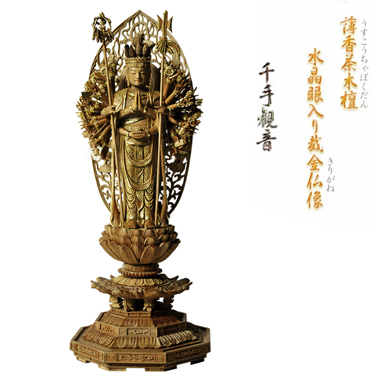 仏像【水晶眼入り 薄香茶木檀切り金仏像:千手観音3.5寸 舟型光背】入眼仏像 送料無料
