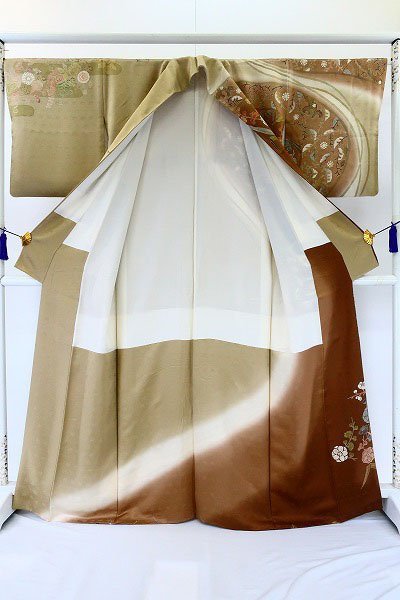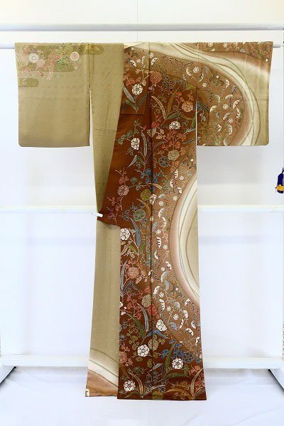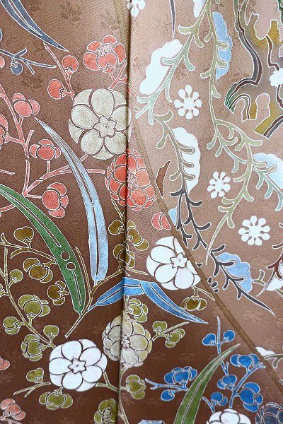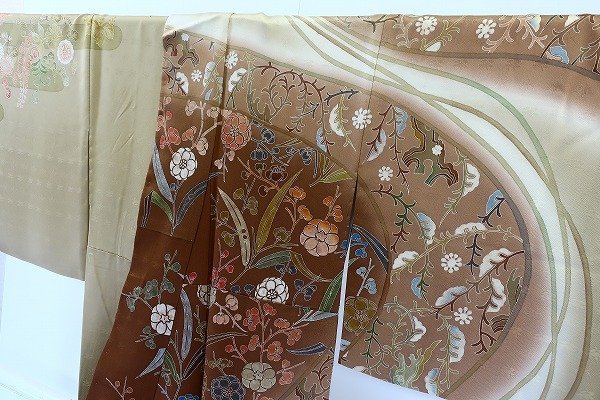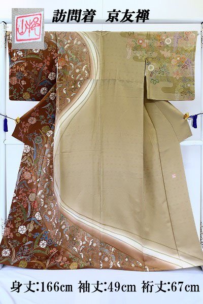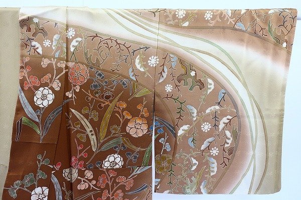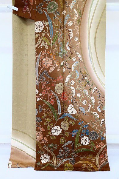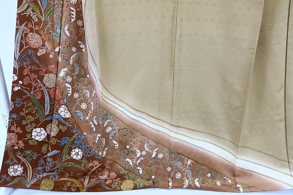 【送料無料】美品 訪問着 京友禅 茶色×薄茶 唐草 梅 藤 菊 トールサイズ 身丈166cm フォーマル 入学式 卒業式 お洒落 上品 正絹 m-5609 |