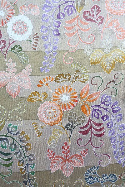 薄茶色の絹地に茶色が染め分けられ、唐草や個性的な梅、藤などが京友禅で描かれた美しい訪問着です。 柄がふんだんに入り華やかな席にぴったりのお品物です。 ※トールサイズです。 ※落款あり 担当:石井 |