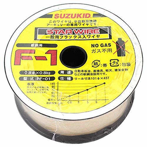 「スター電器製造(SUZUKID)ノンガス軟鋼 0.8φ*0.8kg PF-01」▼4991945020887▼(商品説明)・ 0.8φ×0.8kg PF-01・・PatternName:単品・軟鋼用・重量:0.8kg・ワイヤ径:0.8mm・ワイヤ長:約250m・溶接長(量):約12.5m説明 商品紹介 スターワイヤF-1(総称) ノンガス用軟鋼溶接ワイヤ フラックス入りワイヤを使用したセルフシールドアーク溶接は、シールドガスを必要としない溶接方法です。 風の影響を受けにくく、野外での溶接にも適しています。 ご注意(免責)>必ずお読みください ●フラックス入ワイヤによる溶接はヒュームやガスが発生し、吸い込むと人体に害を及ぼし癌の原因となりますので、保護具(マスク等)の着用や十分な換気をしてください。●スイッチを入れるとワイヤに通電し、人命にかかわりますので、感電に十分注意してください。●溶接の光線は、目や肌を傷めるので、常時乾いた手袋や保護具、適正なフィルタ