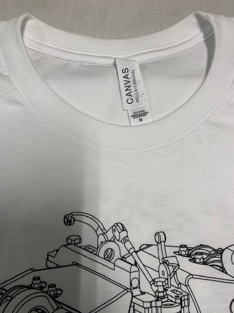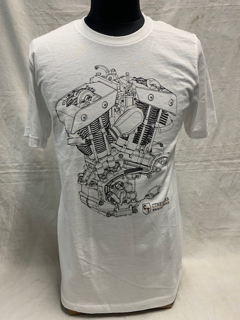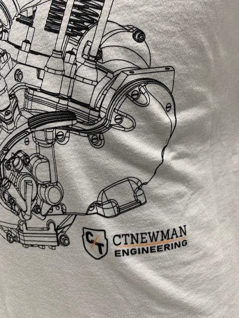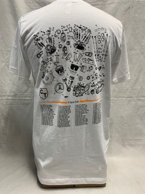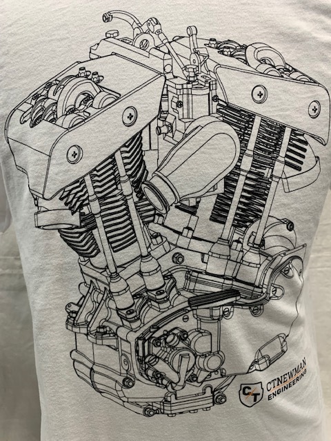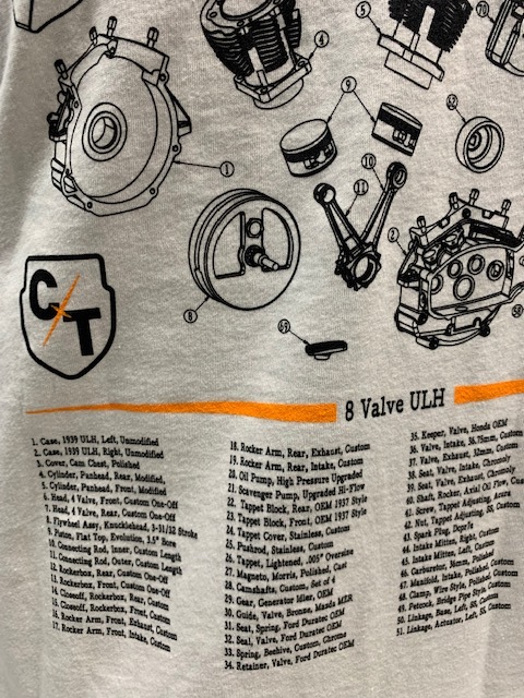 ●L.Aで開催されるボーンフリーで、ヘッド、ロッカー、ロッカーボックスを設計し8バルブにしたULHを出展し、その圧倒的な知識と技術で世界中のバイクビルダーを仰天させたN.Y在住クリスチャン ニューマン本人から入荷しました CT NEWMAN ENGINEERRING製のTシャツです。彼の制作したとんでもない数の部品が一面にイラストで描かれていて、一つ一つに番号がついており、その番号をたどると部品の全てを理解することが出来る素敵なTシャツです。