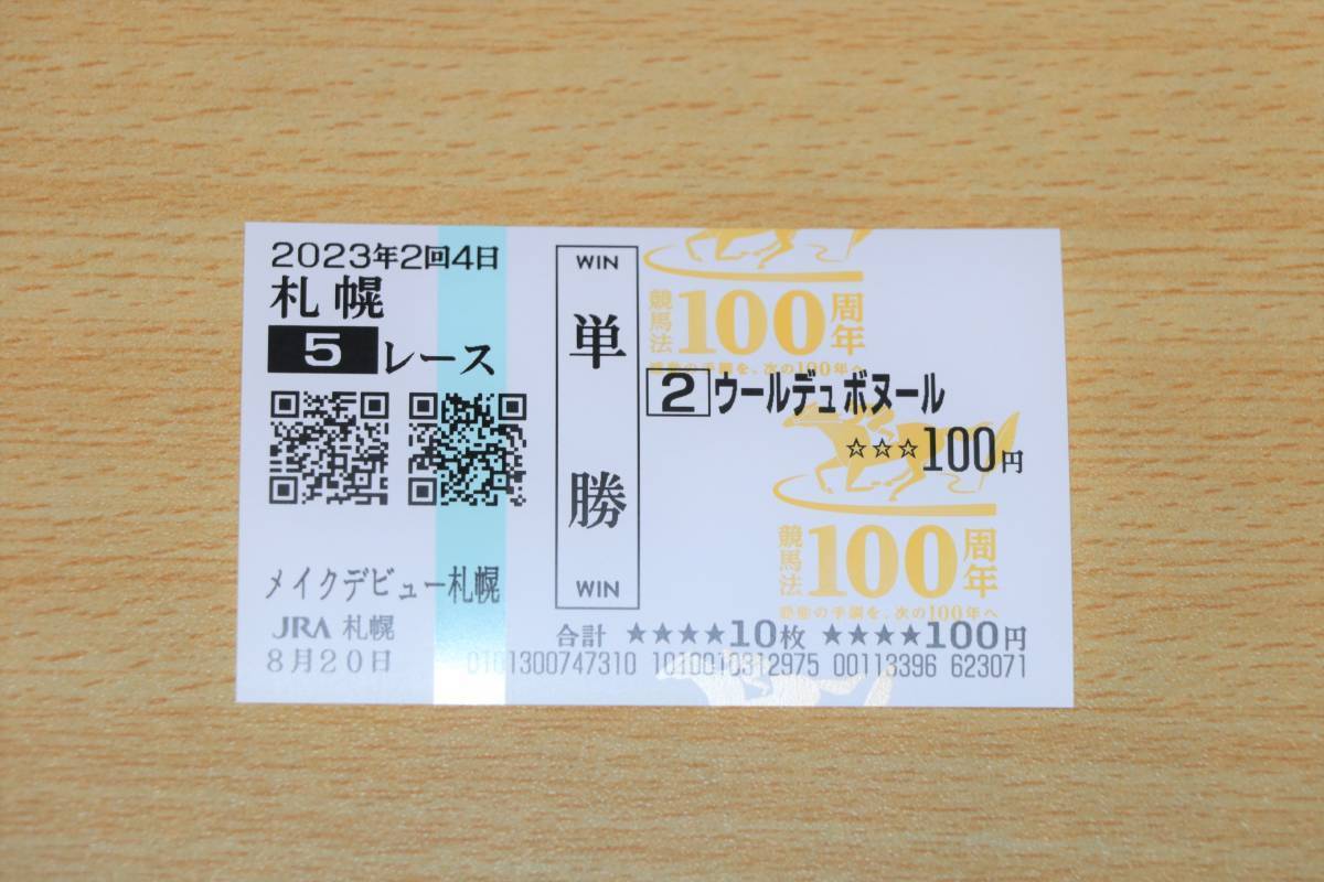 ウールデュボヌール メイクデビュー札幌 5R 1着 (2023年8/20) 現地単勝馬券(札幌競馬場)です。気に入って頂けた方の落札を心よりお待ちしております。商品は定型郵便(110円)で発送となります。どうかよろしくお願い致します。※配当金は240円です。