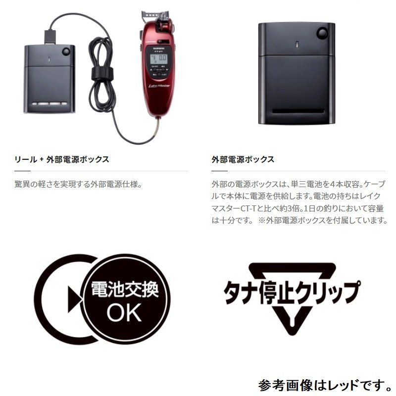 | シマノ 21LAKE MASTER CT-ET レイクマスターCT-ET レッド 新品を出品致します。 手感度と集中力をアップさせる絶対的な軽さ。 目指したのはカウンター付電動リールの中で最も快適かつトラブルフリーにワカサギ釣りを楽しめるリールであること。 実績に磨かれたレイクマスターCT-Tの機能はそのままに外部電源仕様とすることで自重90g(ケーブルを除く)という驚異の軽さで手感度の向上と集中力の持続を両立。 一日を通してストレスなく釣りを楽しめるように外部電源の容量を十分に確保し電池交換のストレスと時間のロスから釣り人を解放します。 棚取り時、指でスプールを快適に回すことができる『縦型スプール』をはじめ、『バックラッシュ防止システム』、『水深補正機能』、『棚停止機能』、文字が大きく見やすい視認性に優れた『大型ドット液晶』を搭載。 圧倒時な軽さに加え小指・中指がリールの下に入る握りやすいフォルムで、かつてない快適さでワカサギ釣りをお楽しみいただけます。 ■外部電源仕様 ■ハイパワーモーター搭載 ■縦型スプール ■バックラッシュ防止システム ■大型ドット液晶 ■水深補正機能 ■自動棚停止機能 ■マットラバーコーティング ■氷上モード搭載 ■船べり自動スローストップ ■アラーム機能 ■糸落スピード表示 ■巻上スピード7段階 ■水面0セット ■電池残量表示 ■左右巻上ボタン切替 ■トラブルレスラインストッパー ■専用外部電源ボックス付(単三形アルカリ乾電池4本仕様) ■転倒防止レッグ付 【仕 様】 自重:90g 糸巻量:PE0.6号-30m ベアリング数:2 取付穴径:5mm ※ワカサギ釣りを楽しんで頂くためには別売のレイクマスターシステム穂先が必要となります。 メーカー本体価格\31,460(税込価格) | |||||||||||||||||||||||||||||||||||