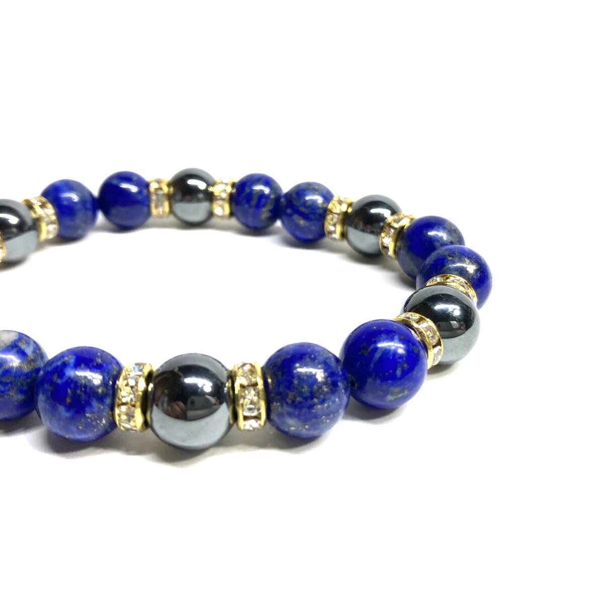 こちらは、ラピスラズリとヘマタイトを組み合わせたパワーストーンブレスレットです。間にはロンデルを挟み高級感あるデザインに仕上げております。石大きさは腕にも馴染みやすいように10mm玉で内径約18cm(伸可能)です。(サイズ変更の場合は取引ナビにてご連絡をお願いします。) 数に限りがございますので気になる方はお早めにどうぞ。