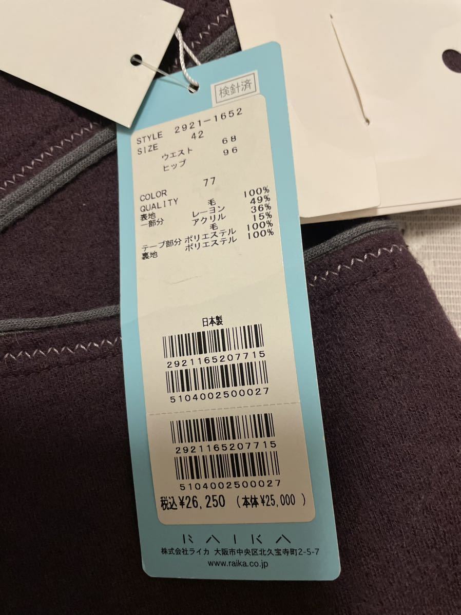 ・ブランド名:plus blue ライカ ・サイズ:42 ・素材:表地~毛100% 一部分〜レーヨン49% アクリル36% 毛15% テープ部分〜ポリエステル100% 裏地〜ポリエステル100% ・平置実寸:W37 総丈67 <素人採寸ですので多少の誤差はお許しください> ・未使用〜タグ付き。定価26250円 とも布、予備ボタンつき ・めだった汚れシミは無い様に思います。保管時のシワが少しあります ・シックなパープル系のお色、グレーの生地やステッチ模様がアクセントになり素敵です ・裾の方は生地が足してあり華やかです。フロントファスナーです ※汚れシミなど出来る限りチェックしておりますが万一見落とし等ございましたらお許しください※ | |||