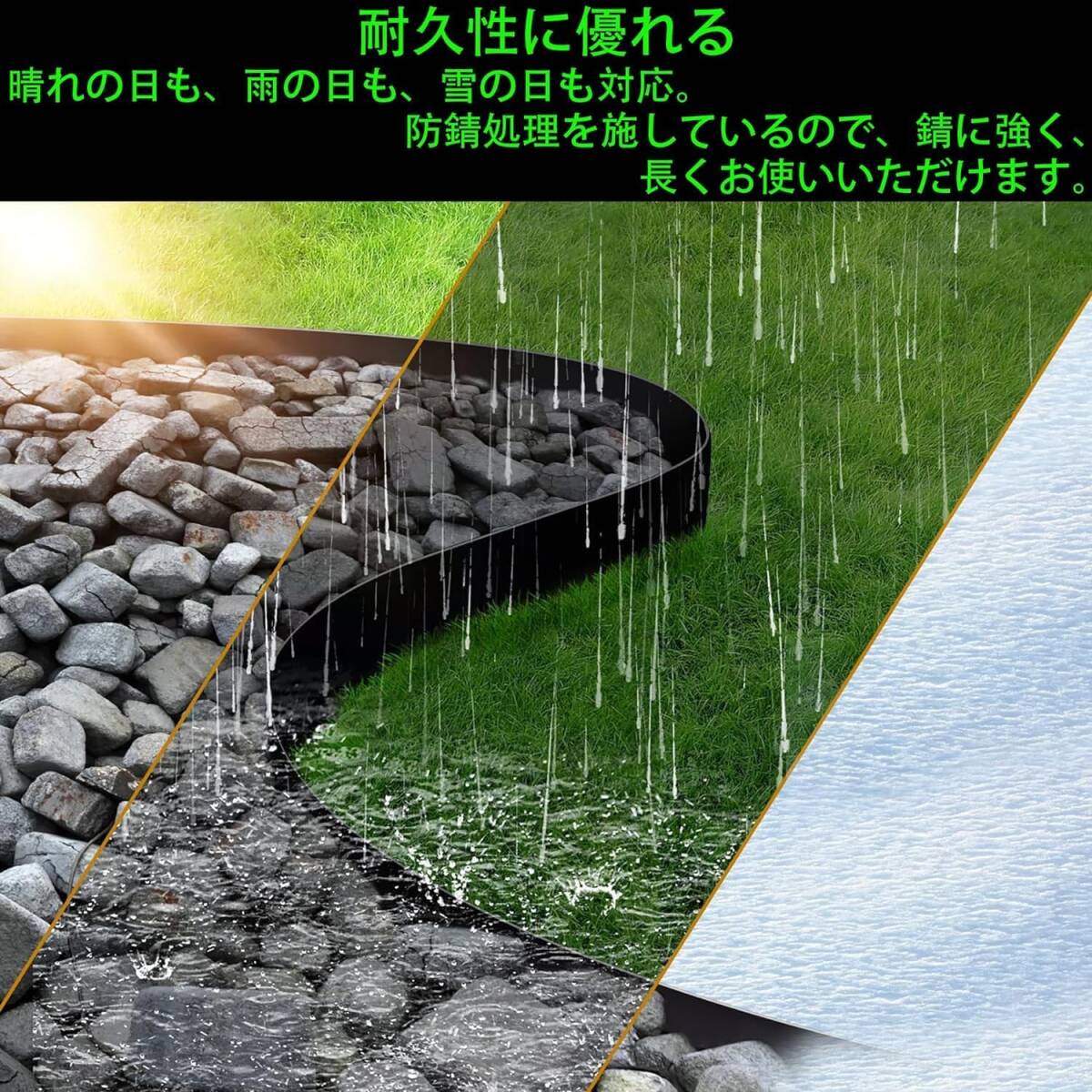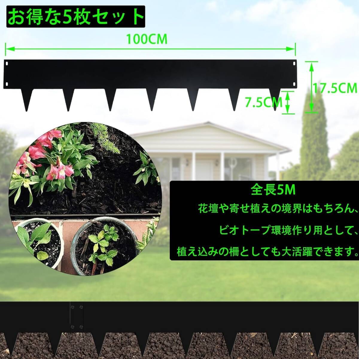 【お得な5枚セット】サイズ:100cm*17.5cm * 5PCS、全長:5m、重量:6.6kg。土留め・芝の根止めや、砂利や人工芝の見切り、花壇づくりに最適な一体型のシートです。