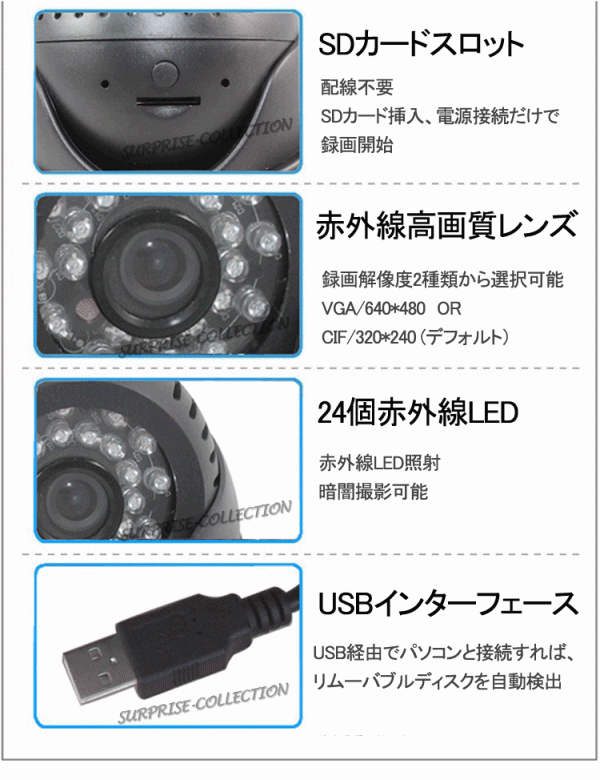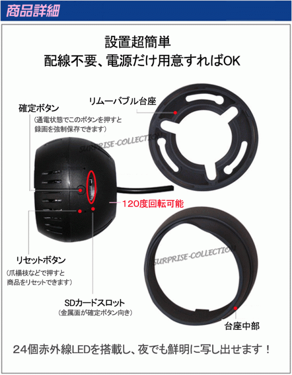 赤外線LED 24個(可視タイプ)センサーによる自動切替のためON/OFF機能なし