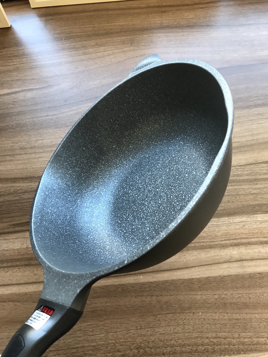 熱効率が良いアルミニウム合金製で、内面は3層フッ素樹脂塗膜加工の細かな石目模様。