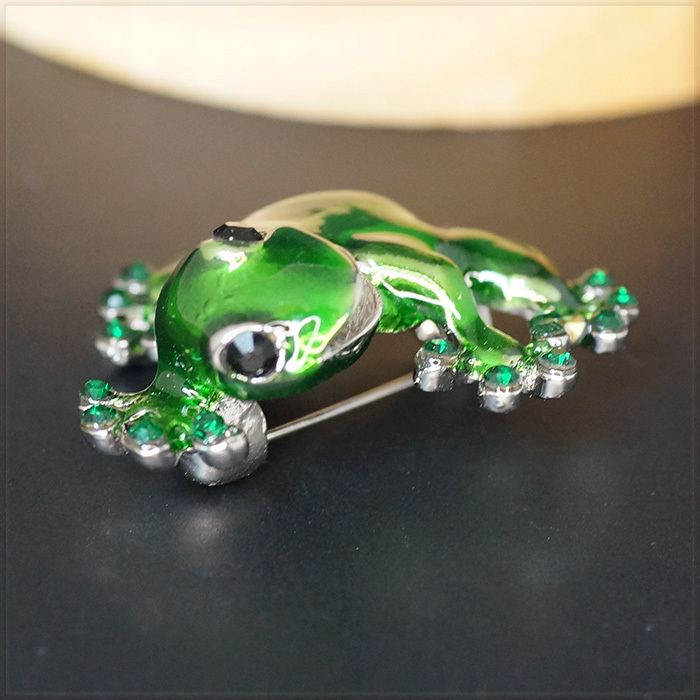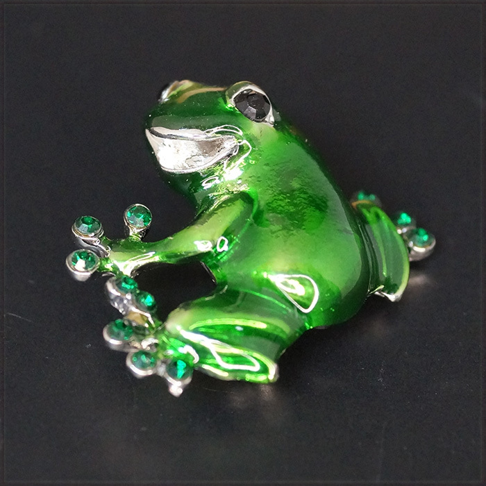 Green Cute Frog シルバー エナメルグリーン ブラックCZ かわいい モリアオガエル 緑色のツリーフロッグ カエル 3.5cm ブローチ です。