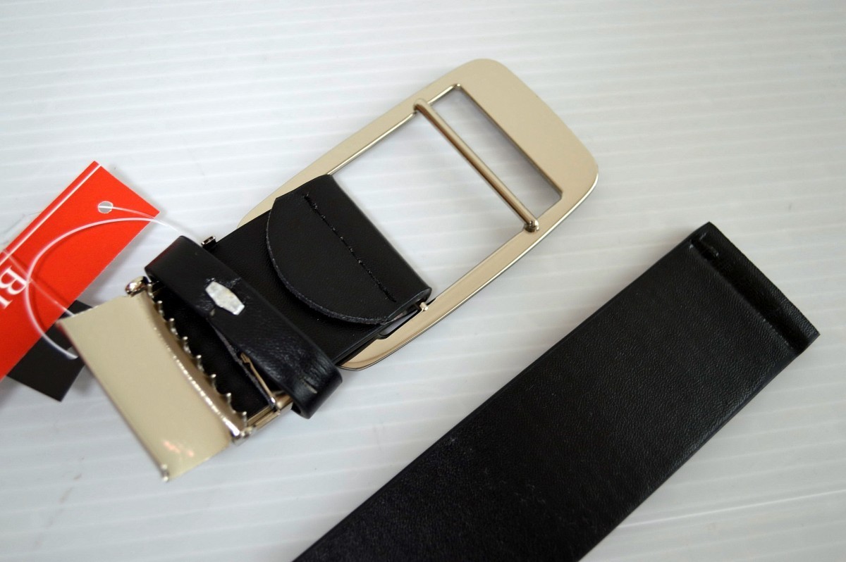 通常のベルトでは難しかった ピンもベルト穴がなく帯をバックルに通してとめる斬新ユニークな作りとなっています。そのため、フリーサイズでの使用が可能で、季節ごとに変わる服の厚みなど多少ウエストが増しても問題ありません。しかも、ベルトの締め過ぎによる穴の摩耗という心配が要りません。シンプルなバックルを使用していますのでビジネスもカジュアルも兼用で使える万能ベルトです。素材は 厚みのある合成皮革を使用しています。