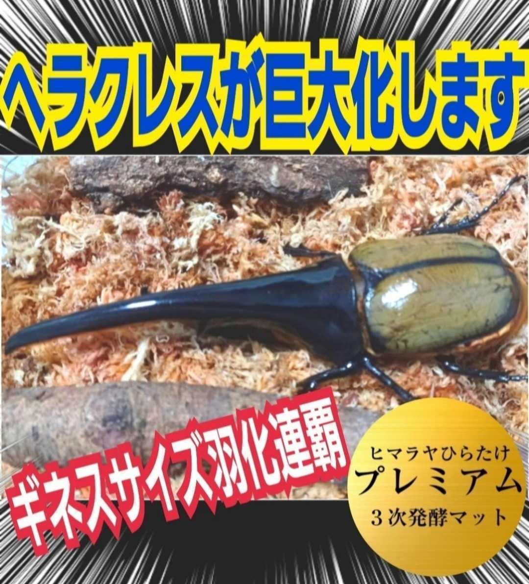 ヘラクレスなど外産、国産のカブトムシもギネスサイズがでています。 ヒマラヤひらたけ菌床を粉砕発酵したマットに特殊アミノ酸を通常の3倍配合してありますのて抜群の栄養価です。 | ||