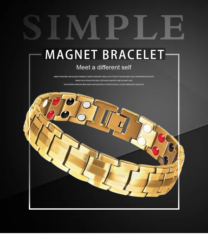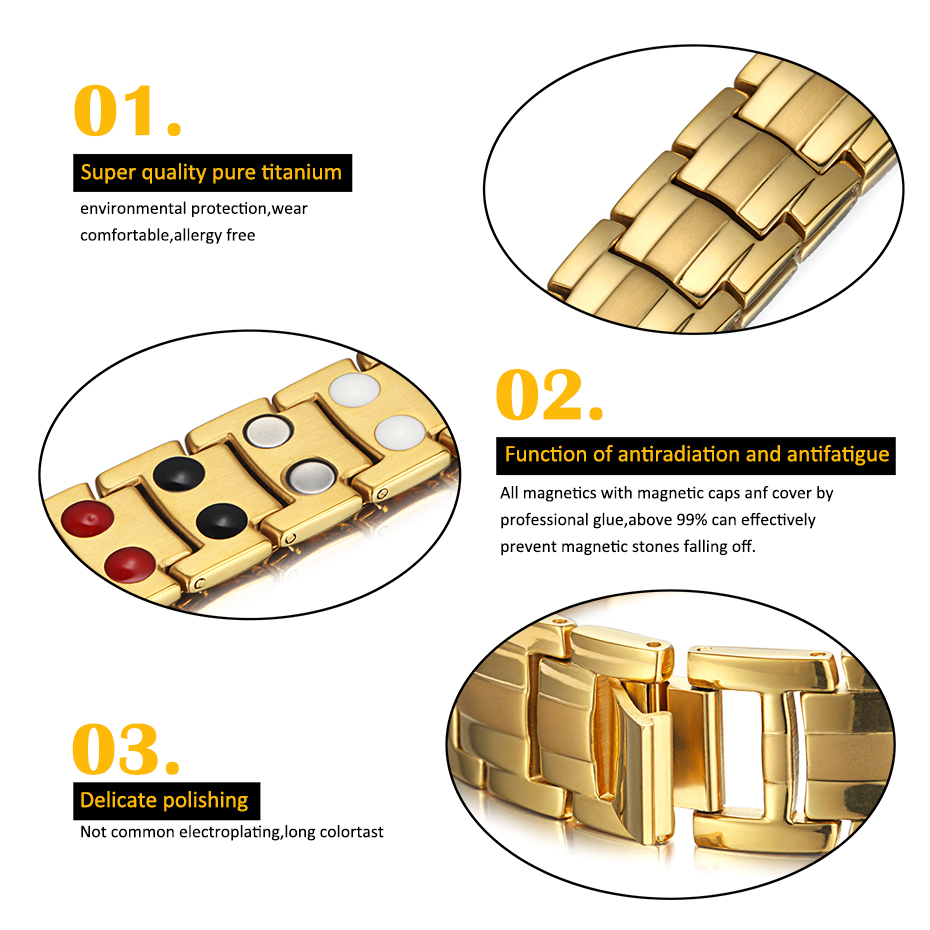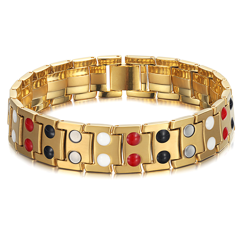 ゲルマニウム、遠赤外線、磁石、マイナスイオンがずらりと並んだ贅沢なブレスレットです。 外側はマットゴールド+ゴールドで統一されたシンプルでおしゃれなデザインですので、いかにもな健康器具はちょっと…という方にもおすすめです。 色違いのブラックもございます。 本体はステンレススチール製でずっしりと高級感のある素材です。 水、サビ、傷に強く、屋外の作業が多い方やスポーツをされる方でも安心してお使いいただけます。 黒のべロア巾着ポーチに入れて発送いたします。 父の日、敬老の日、クリスマス、バレンタイン、誕生日、結婚記念日など、プレゼントにも。 ※サイズ調整いたします!※ どなたにも対応するため長さが22cmと比較的大きめなつくりです。 パーツを外しての調整となりますのでおおまかにはなりますが、ご希望の長さをお申し付けいただけましたらある程度沿えるよう調整して発送いたします。 (当方女性ですが、私の手首ですとパーツ6個分を外してちょうど良いくらいでした。そのままでは手からすり抜けます。) 時計屋でもサイズ調整は可能です。 ★ゲルマニウム…10粒(黒) 体内の電磁波、重金属を取り除き、身体のプラスマイナス電位を適度に保てると言われています。 血液循環不快感を軽減、睡眠改善を向上させて、疲労と緊張の低減を目的としています。 ★遠赤外線…12粒(赤) 人間が本来持っている自己治癒力を高め、老廃物・異物の排泄を促進し、新陳代謝を改善します。 それによって活力維持・疲労を和らげる効果があるとされています。 ★マグネット…12粒(銀) 生体電気と生体磁石の調整を担います。 強力磁気で不調と鬱憤を緩和し、心を落ち着かせて睡眠改善を向上させて、疲労と緊張を和らげると言われています。 ★マイナスイオン…10粒(白) マイナスイオンは知られているとおり、殺菌消毒作用で空気中の細菌をクリアし、空気を清潔にする効果があります。 また、血液の粘度を下げさせることができるとされ、心臓血管の疾病、心臓病と中風の機率を減らすことを目的とした治療にも使用されます。 ■詳細スペック ブレスレット全長:約22cm ブレスレット幅:約1.5cm 本体素材:ステンレススチール+ゴールドメッキ 含有有効素材:ゲルマニウム、遠赤外線、マグネット、マイナスイオン 重さ:約59.5g |