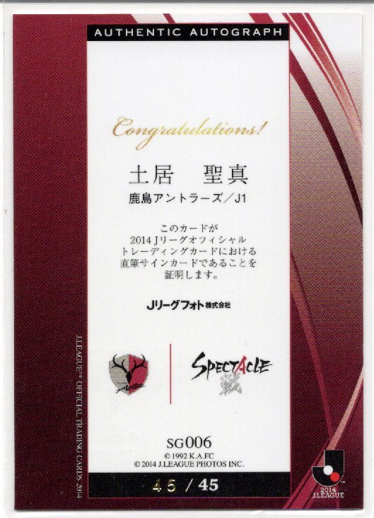 2014 Jリーグ オフィシャルカード 鹿島アントラーズ 土居 聖真 直筆サインカードです