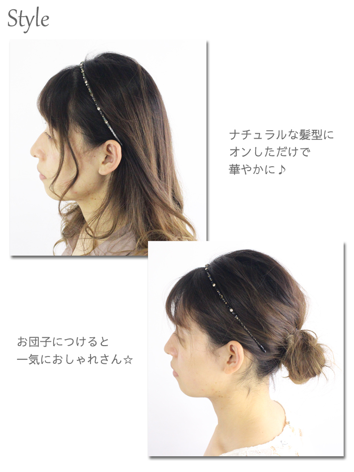 | 商品説明 | ラインストーンと異種ビーズのたっぷりのカチューシャ。 1つに束ねた髪にONしてデイリーアクセとして使ったり、 パーティーなどのアレンジヘアに重ね付けしたり、と幅広く使えるデザインです。 |