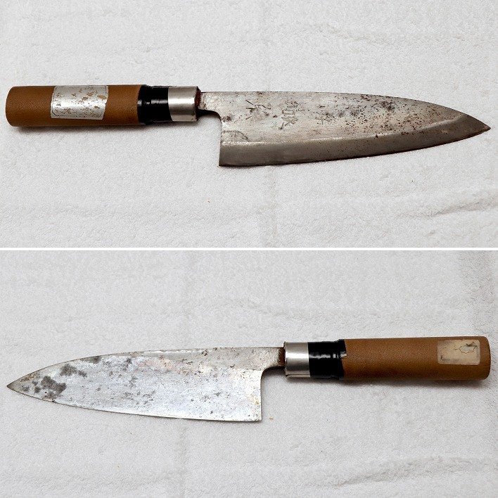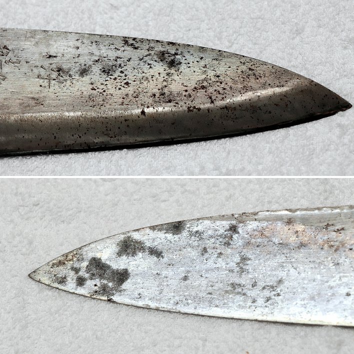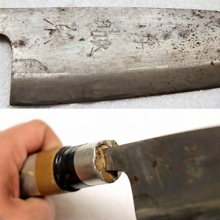 刃渡り:約182mm、全長:約331mm、重さ:約332g、サビ・使用感あり、状態は画像をご覧ください。状態ランク:D