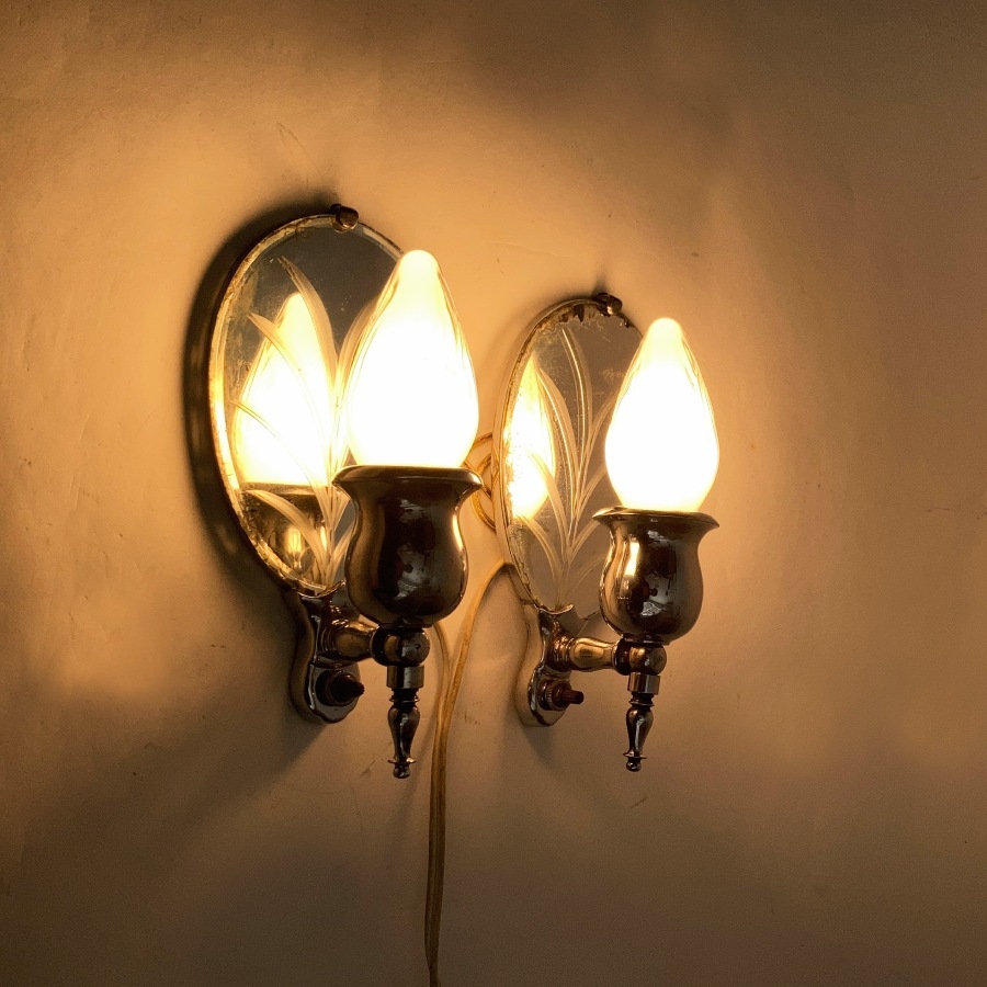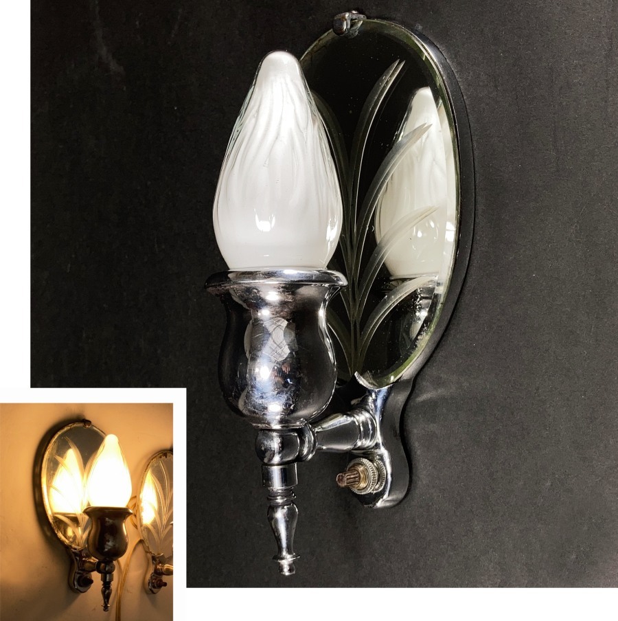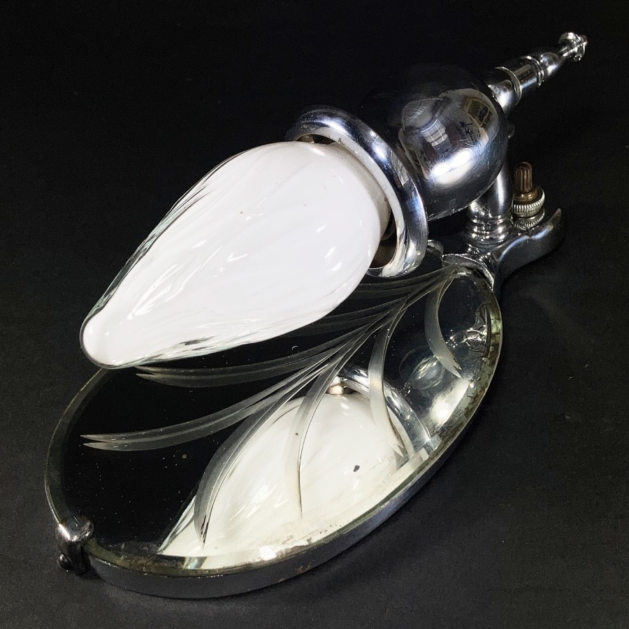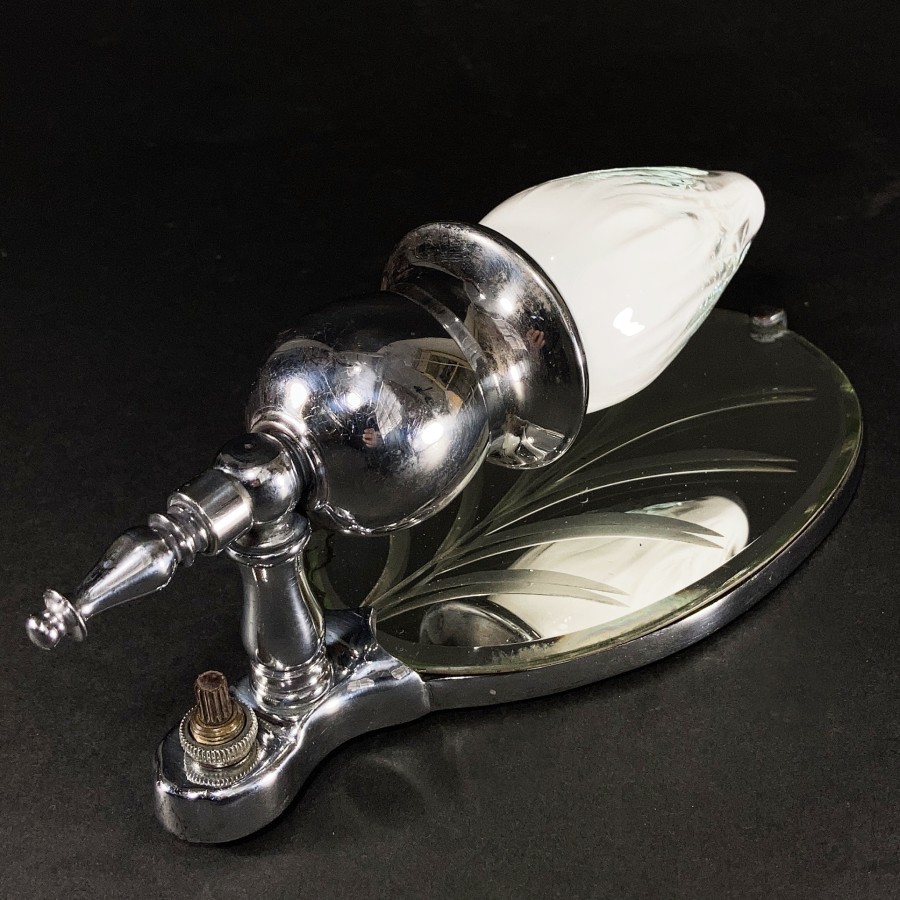 アメリカ製1930年代のキャストブラス(鋳造)製キャンドルランプです。 当時のキャンドルランプとしては、磁器製の物が多いですが、キャストブラス製の物で、さらにバックに鏡がはめ込まれている物は非常に珍しいです。 本体はアールデコなデザインで、"シルバー・ニッケルメッキ" です。オリジナルのロータリースイッチ(時計回り)付きです。 オリジナルの鏡にはリーフデザインがカットされており、外周も面取りしてあり、当時物らしいデザインで良い造りです。 経年使用による裏の銀面のヤレはあるものの、リアルアメリカン・バスルームランプのようで、雰囲気の良いコンディションです。 基本的に日本で言う所の脱衣所の洗面台のサイドに設置するものですが、キッチンやベッドルームなどにも良さそうです。 2枚目の画像は2台設置した場合のイメージ画像ですが、通常2台使用する際は、例えばシンクの上に貼られたにミラーの両サイドなどに設置します。 現在、 >> もう一台同じ物 が在庫ございますので、ペアがご希望の方はこの機会にぜひ。 トップのマイナスネジを緩めると鏡が上へのスライドで取れますので、設置もしやすいです。 写真撮影の為にコンセントを仮付けして、ライトアップしましたが、配線は末端でカットしてあります。 配線は新品に交換されておりますが、取り付けには、プロの知識と技術が必要とお考え下さい。 電球は含まれませんが、電球の口金サイズは日本でごく一般的なE26サイズです。 ◆SIZE◆ H:21cm×W:10cm×D:9cm(全体) H:14cm×W:10cm(鏡部分) |