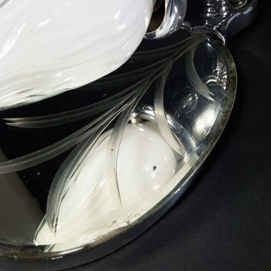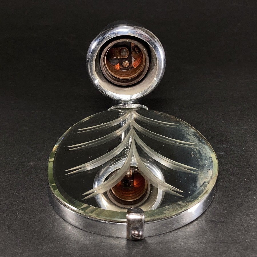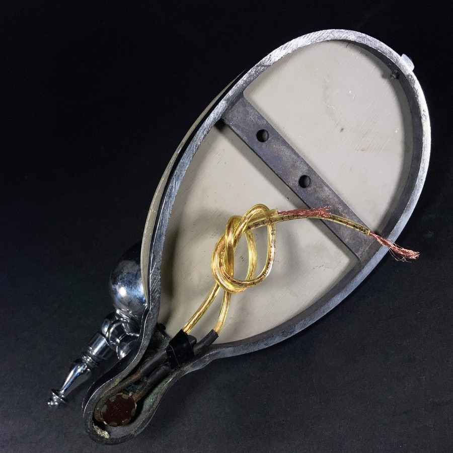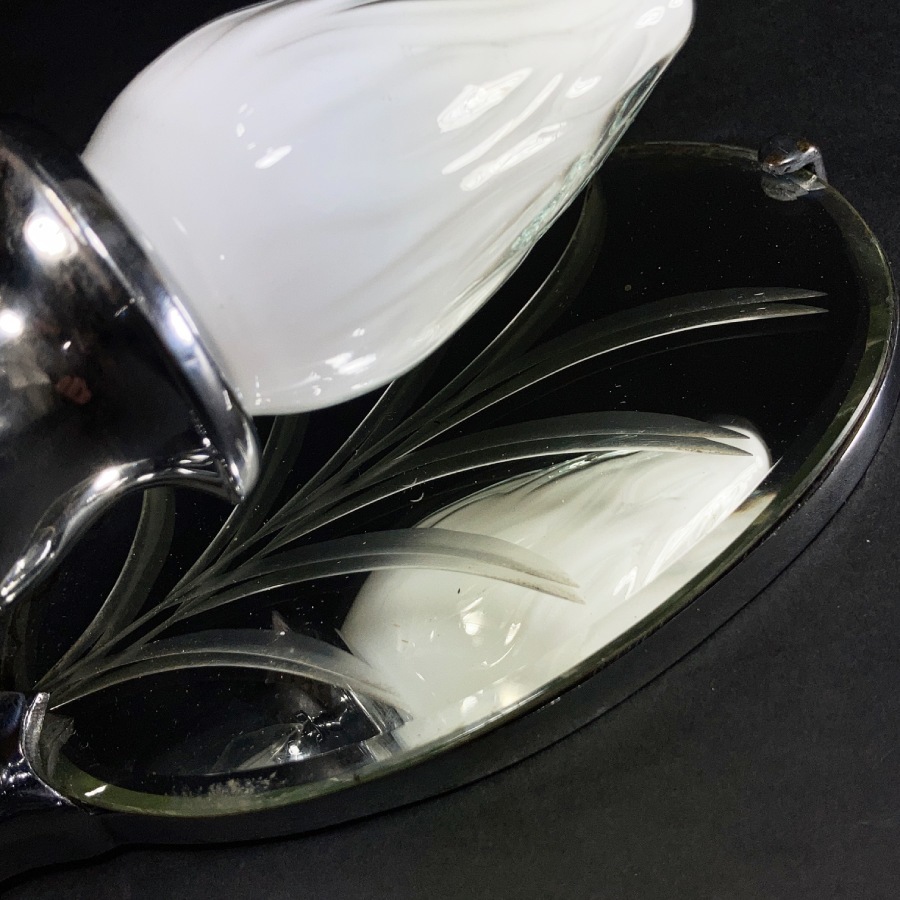 アメリカ製1930年代のキャストブラス(鋳造)製キャンドルランプです。 当時のキャンドルランプとしては、磁器製の物が多いですが、キャストブラス製の物で、さらにバックに鏡がはめ込まれている物は非常に珍しいです。 本体はアールデコなデザインで、"シルバー・ニッケルメッキ" です。オリジナルのロータリースイッチ(時計回り)付きです。 オリジナルの鏡にはリーフデザインがカットされており、外周も面取りしてあり、当時物らしいデザインで良い造りです。 経年使用による裏の銀面のヤレはあるものの、リアルアメリカン・バスルームランプのようで、雰囲気の良いコンディションです。 基本的に日本で言う所の脱衣所の洗面台のサイドに設置するものですが、キッチンやベッドルームなどにも良さそうです。 2枚目の画像は2台設置した場合のイメージ画像ですが、通常2台使用する際は、例えばシンクの上に貼られたにミラーの両サイドなどに設置します。 現在、 >> もう一台同じ物 が在庫ございますので、ペアがご希望の方はこの機会にぜひ。 トップのマイナスネジを緩めると鏡が上へのスライドで取れますので、設置もしやすいです。 写真撮影の為にコンセントを仮付けして、ライトアップしましたが、配線は末端でカットしてあります。 配線は新品に交換されておりますが、取り付けには、プロの知識と技術が必要とお考え下さい。 電球は含まれませんが、電球の口金サイズは日本でごく一般的なE26サイズです。 ◆SIZE◆ H:21cm×W:10cm×D:9cm(全体) H:14cm×W:10cm(鏡部分) |