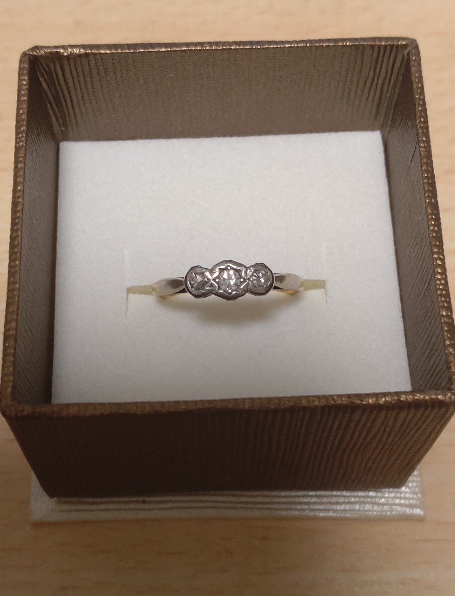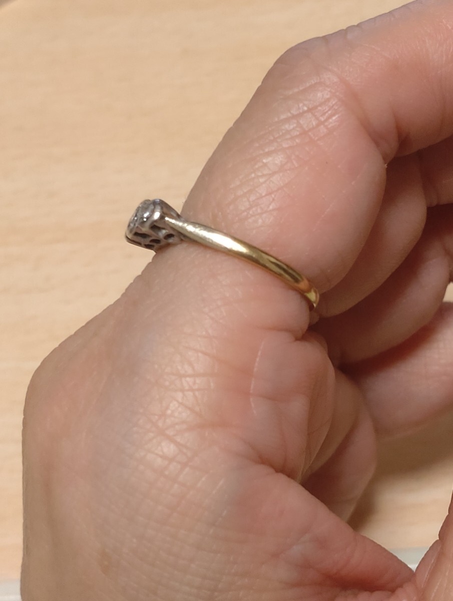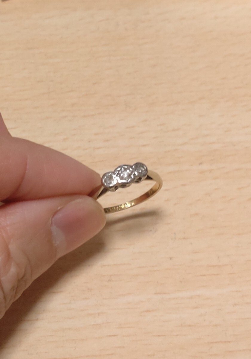 アンティークのダイヤモンドリングです。ダイヤが3石埋まったようなデザインで、ダイヤの枠の部分はプラチナ、リング部分はイエローゴールドです。