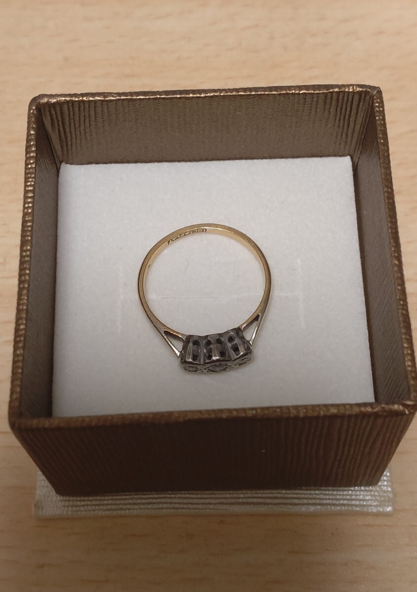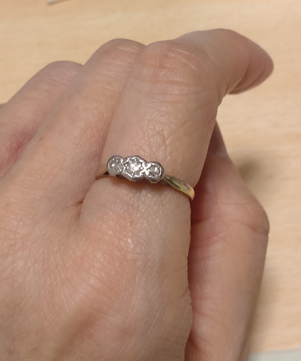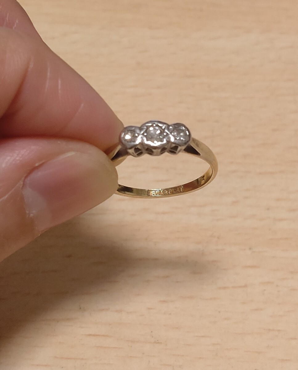 アンティークのダイヤモンドリングです。ダイヤが3石埋まったようなデザインで、ダイヤの枠の部分はプラチナ、リング部分はイエローゴールドです。