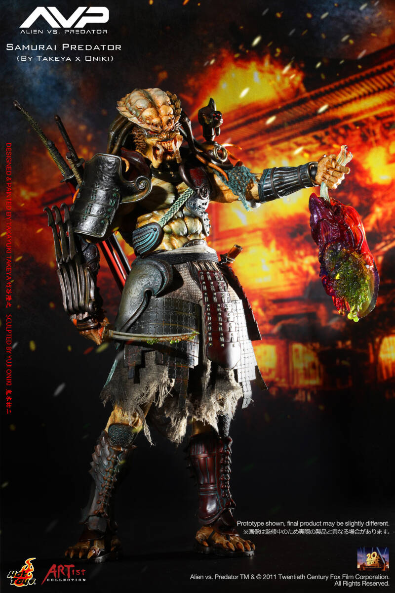 造形作家界の巨匠である竹谷隆之氏がデザインを担当し、偉才・鬼木祐二氏が原型製作を行い誕生したジャパニズム溢れる1/6スケールのサムライ・プレデター。22箇所以上が可動する新規ボディで、戦国時代に出現したプレデターが鬼神の如く戦う姿を見事に立体化している。狂暴さが溢れるフェイスパーツは顎部が可動し、牙パーツを差し替えれば雄叫びの表情に。兜と面頬の装着で武将姿も演出できる。武器はエイリアンの体液で熔けかかった日本刀に加え、もちろんプラズマ・キャノンと右腕のリスト・ブレイドを装備。アクセサリーは、戦利品である腰に束ねたエイリアンの舌、討ち取ったエイリアンの生首が付属する。ジオラマ台座には、仕留めたエイリアンの残骸が散乱し、より臨場感を満喫できる仕様になっている。